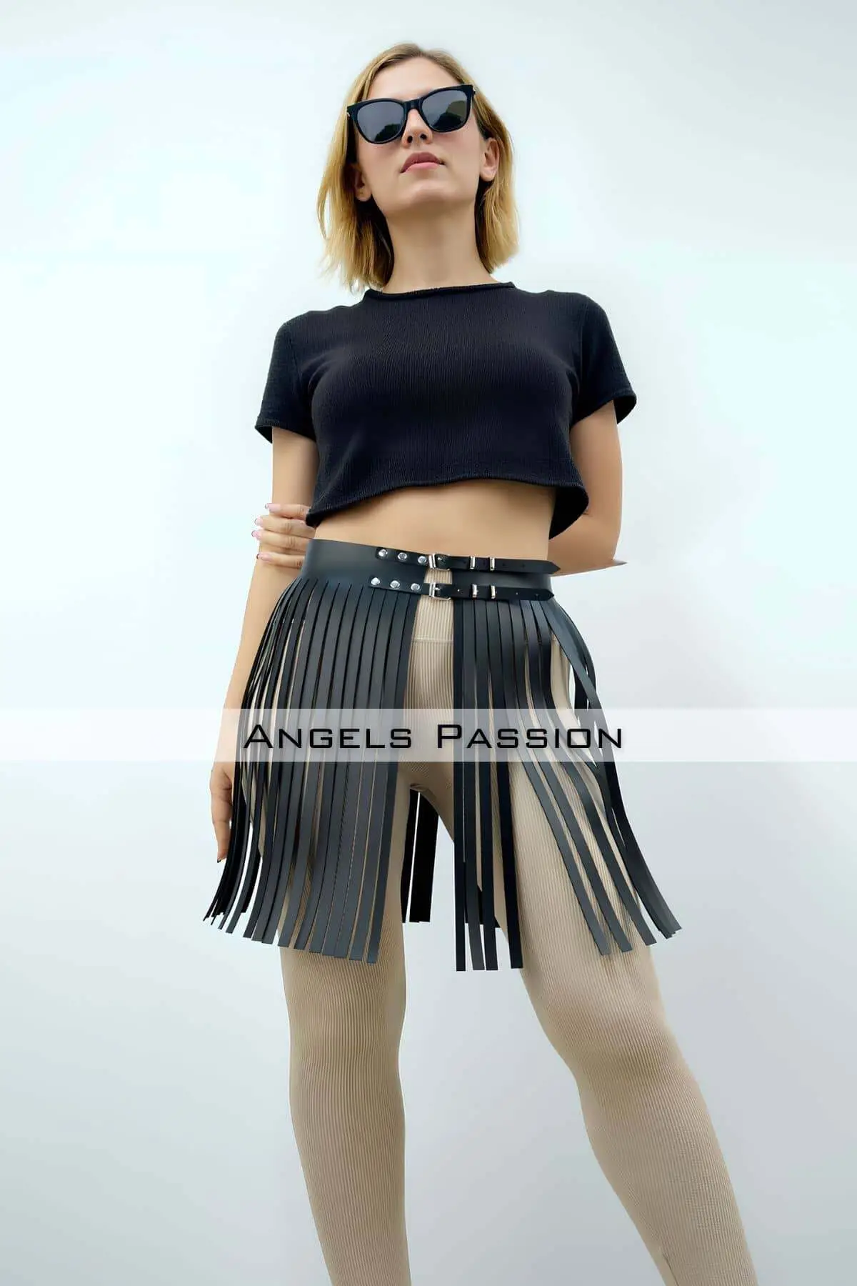 This Stylish Tassel Leather Skirt is meticulously constructed to offer both durability and aesthetic appeal. The resilient faux leather waist band ensures a comfortable and secure fit, allowing the individual tassel strips to cascade freely and dramatically. The versatile design functions purely as a sophisticated **tassel overlay** accessory, easily adjustable to suit various body types when styled over different garments. At approximately 47 cm, the mini skirt length provides the perfect dramatic frame for knee-high boots or heels, making it essential for themed events or performances. For an even more layered aesthetic, consider adding a complementary Garter Harness underneath.