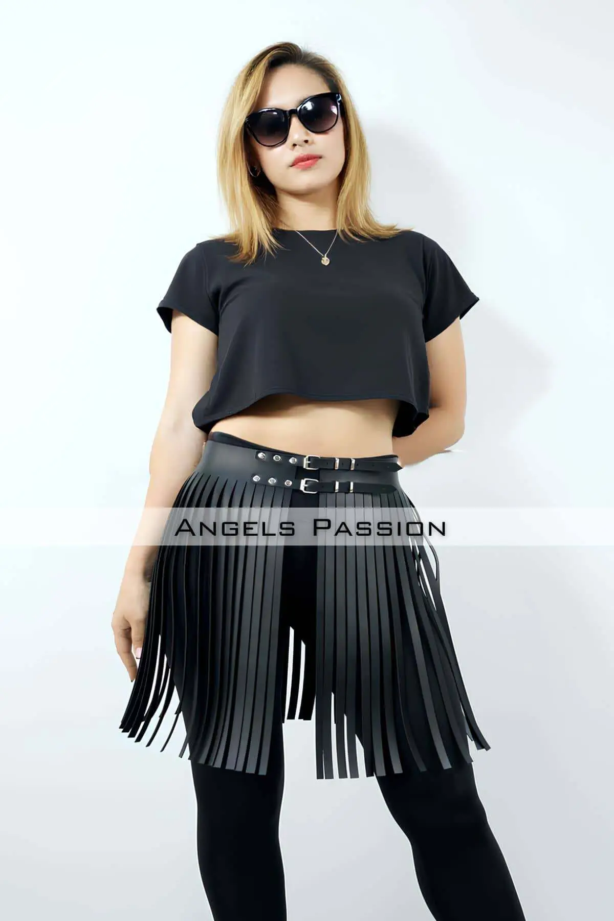 47 cm Stylish Tassel Leather Skirt, Tassel Skirt Over Shorts, Stylish Tassel Mini Skirt – SH1401