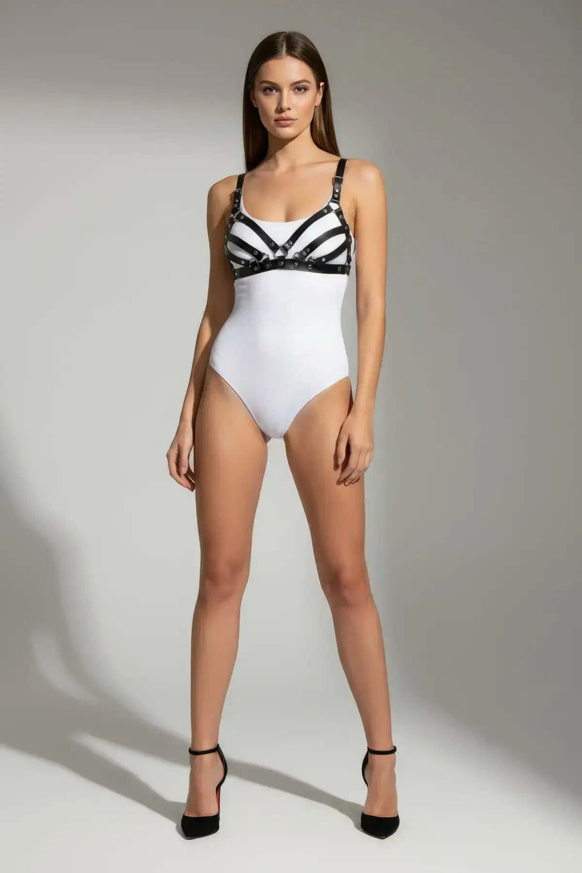 Embrace the rebellion with this standout edgy fashion accessory. The visual detail of the silver-tone hardware and the contrasting smooth black material ensures this item is an immediate attention-grabber. The careful arrangement of the straps creates a flattering, geometric structure that highlights the upper body. It transforms any basic outfit—from simple club wear to a festival ensemble—into a high-impact, dominant look, embodying bold, unapologetic style.