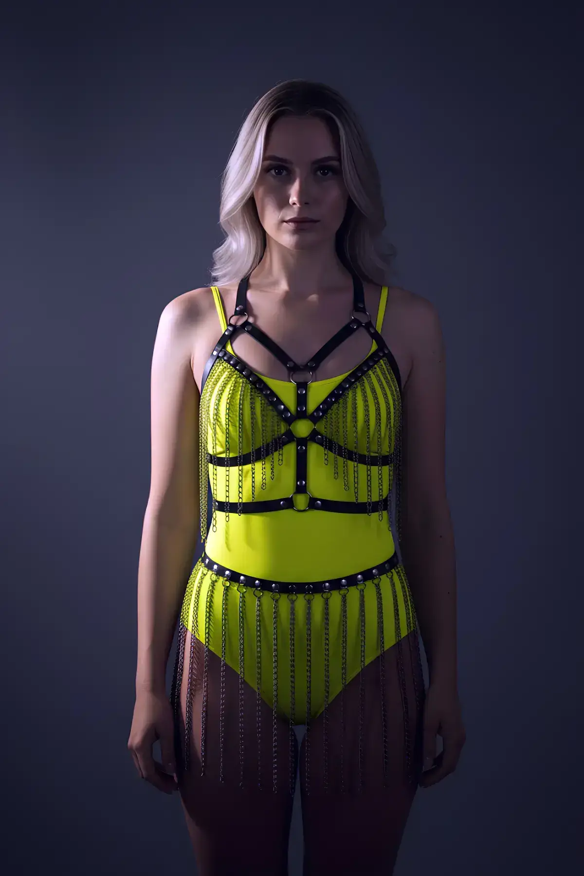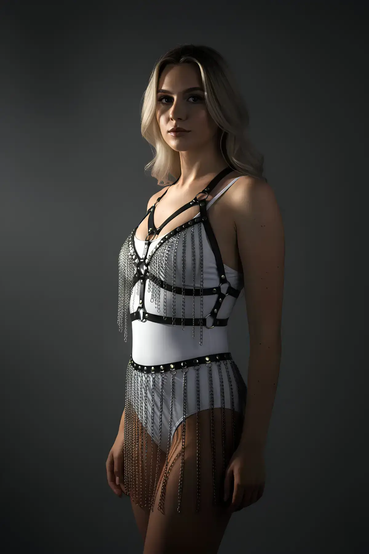 The deliberate incorporation of chains makes this more than just a simple skirt. The contrasting silver-toned hardware against the deep black fabric and belt ensures the Black Skirt with Leather Belt remains the focal point of any ensemble. The adjustable belt is key to achieving that perfect fit and features a sturdy metal buckle closure. Pair this Leather Skirt with a graphic tee, fishnets, and one of our signature Body Harness pieces for a truly memorable club or festival look. It is an essential component of versatile statement apparel.