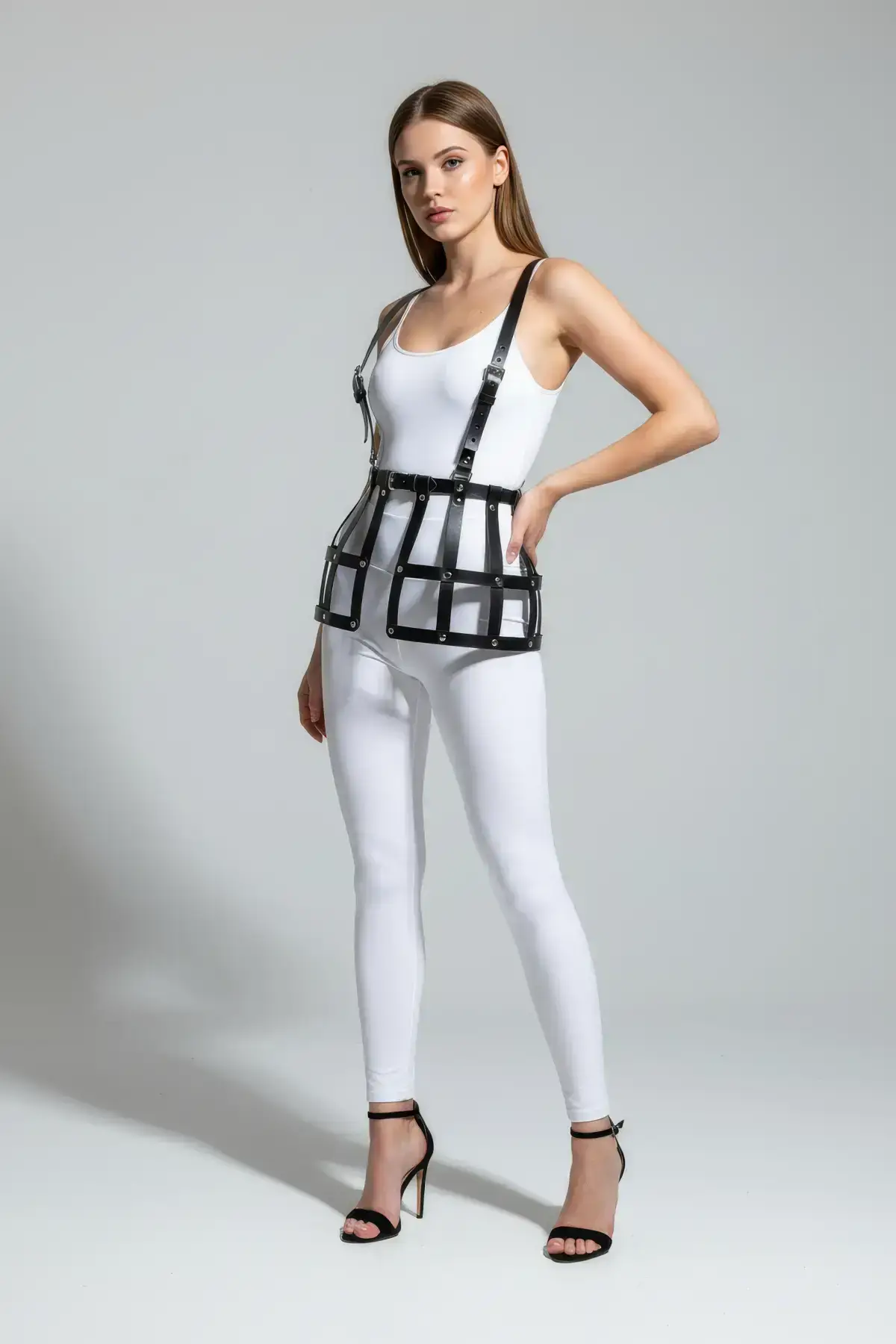 • 🎭 Edgy Cage. Faux leather straps form a cage.