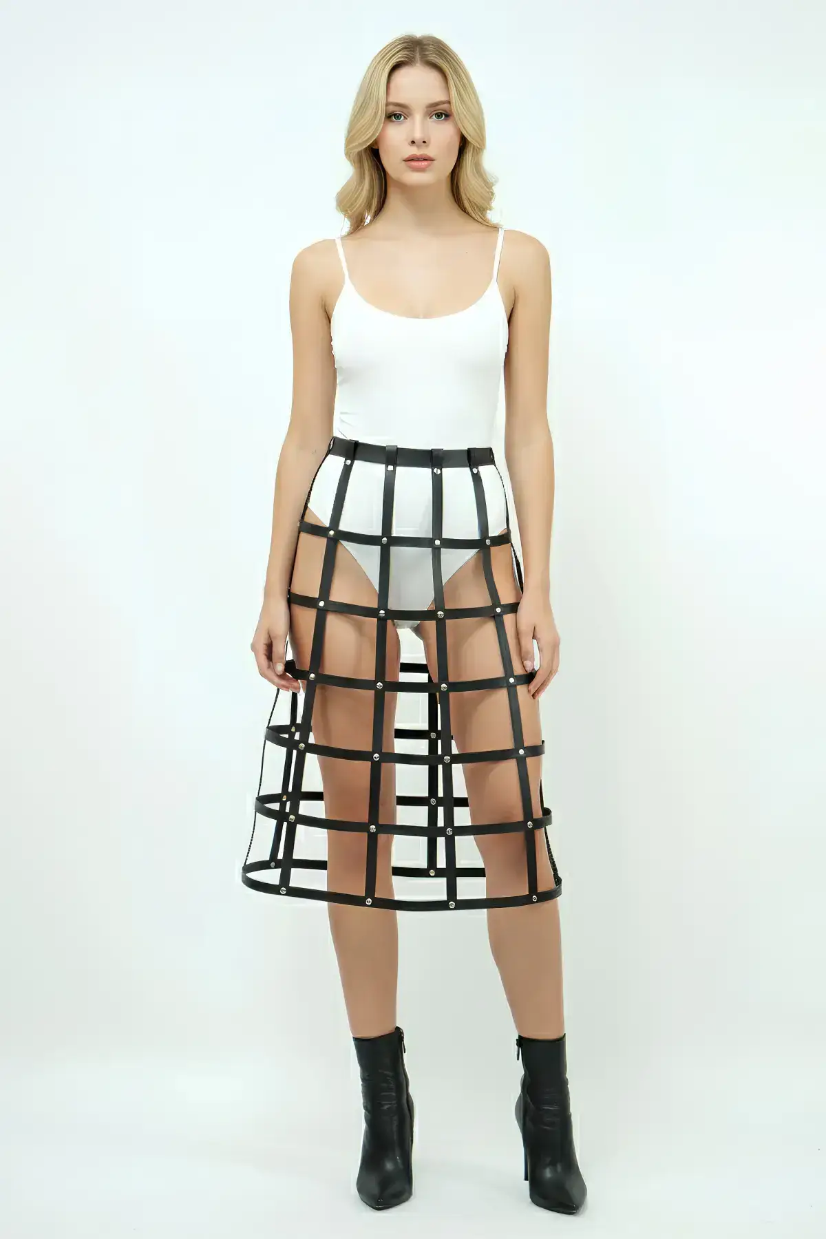 We designed this piece for the confident wearer who values structured tailoring and unique detail. The striking cage detailing is a focal point, crafted from premium quality trim, giving the illusion of a separate Women’s Harness element integrated directly into the garment. This makes it an effortless choice for parties, festivals, or elevating everyday streetwear. The angular design perfectly complements accessories. Pair this spectacular Midi Length Leather Skirt with one of our edgy Women’s Belt options for a fully cohesive ensemble.