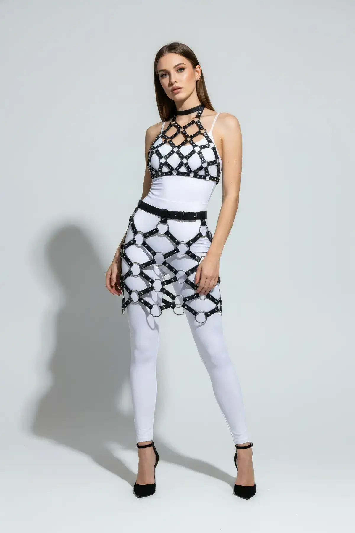 This isn’t just a skirt; it’s a meticulously designed statement piece. The base is smooth, premium-quality faux leather, offering a luxurious look and feel while remaining ethical and durable. The intricate cage pattern overlay is secured with sturdy stitching and high-shine hardware, guaranteeing this Black Faux Leather Skirt will maintain its shape and impact wear after wear. The structured design and quality material demonstrate expertise in creating bold and lasting apparel, perfect for the modern fashion enthusiast.