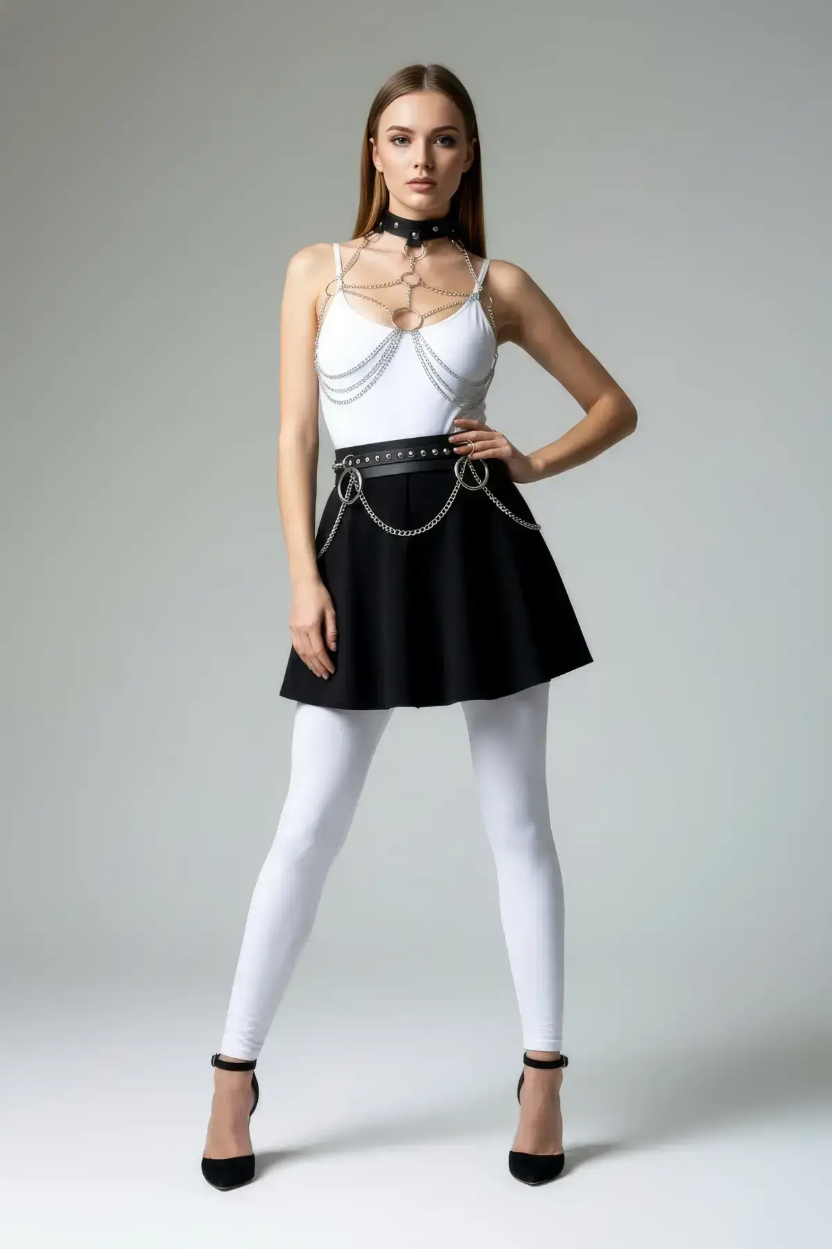 The intricate silver-tone chain draping adds a dynamic, rock-and-roll flair that catches the light and the eye. Made from high-quality faux leather, this belt offers both durability and a supple feel without compromising your values. Pair it with an equally daring Choker to complete your bold aesthetic.