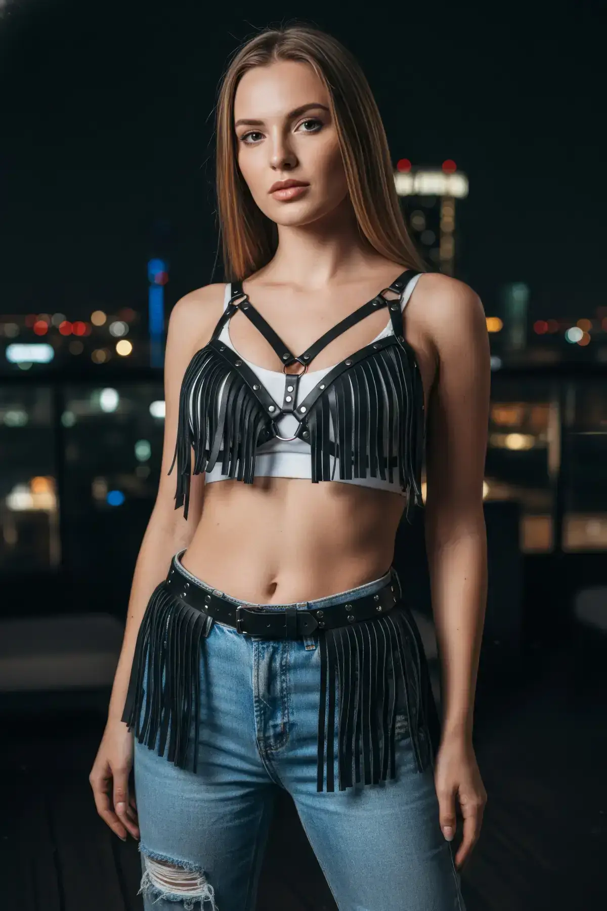 79,9 $Leather Belt with Tassel Detail on Shoulders, Strappy Leather Harness – SH1004