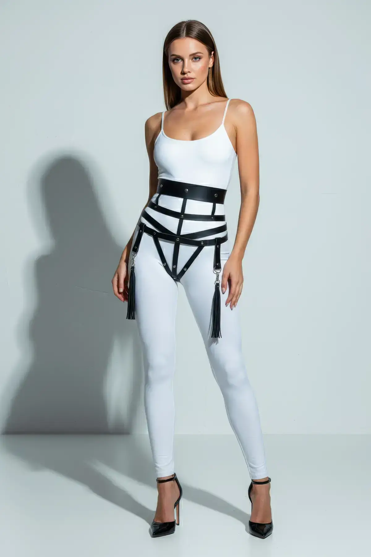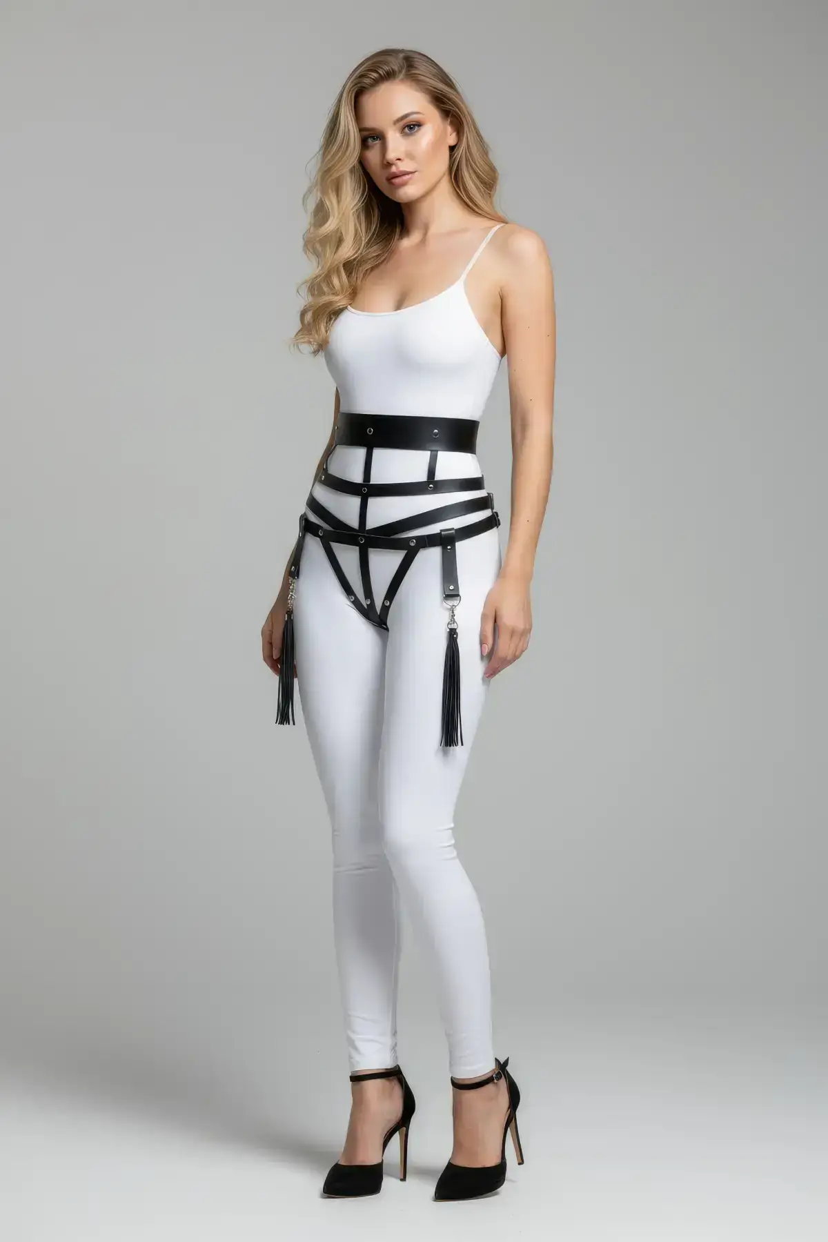 The dramatic, long tassels attached to the bottom edge introduce dynamic movement to your look, ensuring you turn heads with every step. These playful yet edgy accents soften the intensity of the corset structure, creating a balanced and captivating piece. Pair this statement cincher with pieces from our extensive Women’s Harness range for an unforgettable, fully accessorized ensemble. This piece proves that functionality and intense fashion can seamlessly combine.