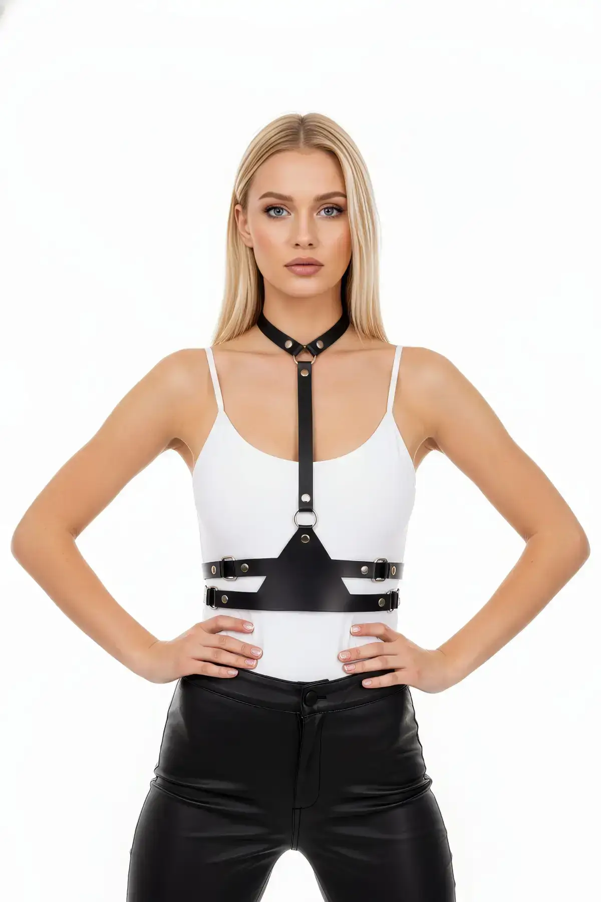 Step into the spotlight with the black women’s leather belt body accessory, an intricate piece designed to elevate any outfit. This unique design combines the structure of a belt with the elegance of a neck detail, creating a unified and captivating silhouette. It is the perfect blend of edgy style and feminine allure, ensuring all eyes are on you from the moment you walk in.