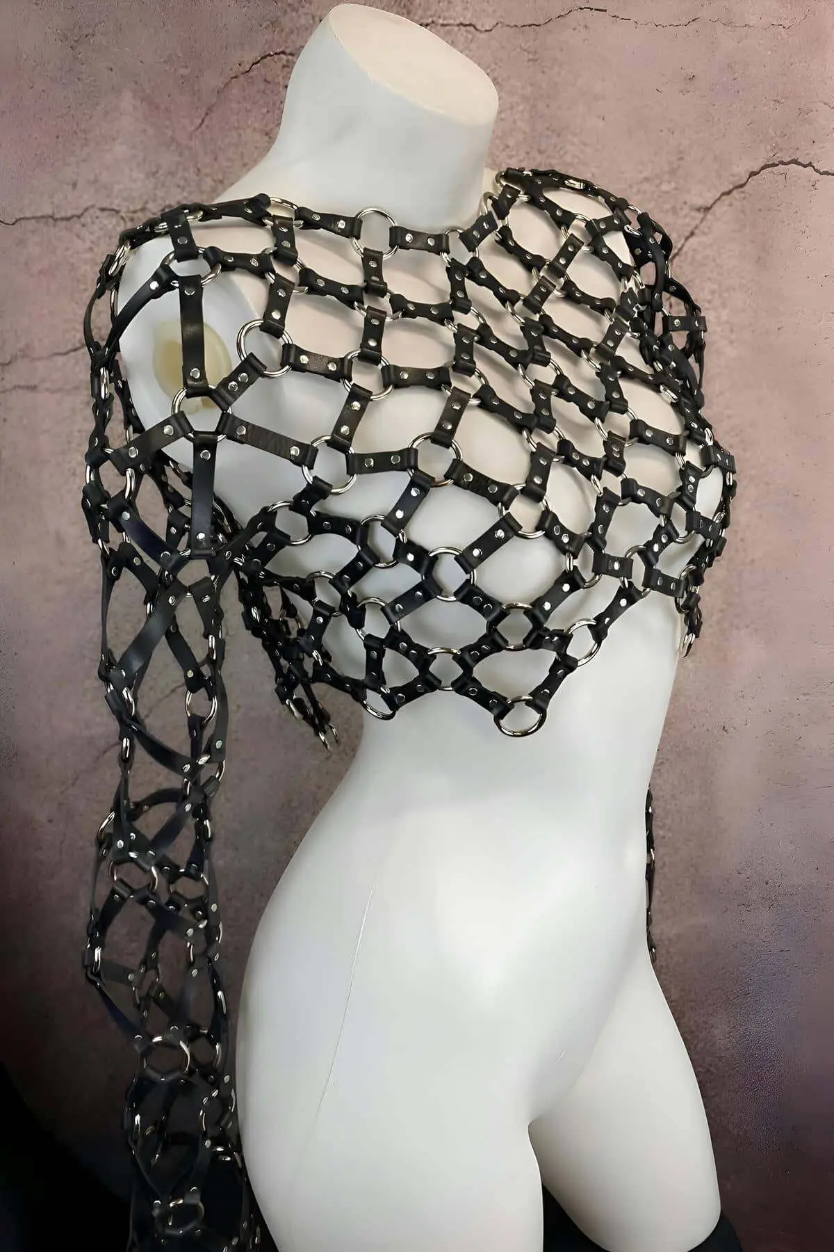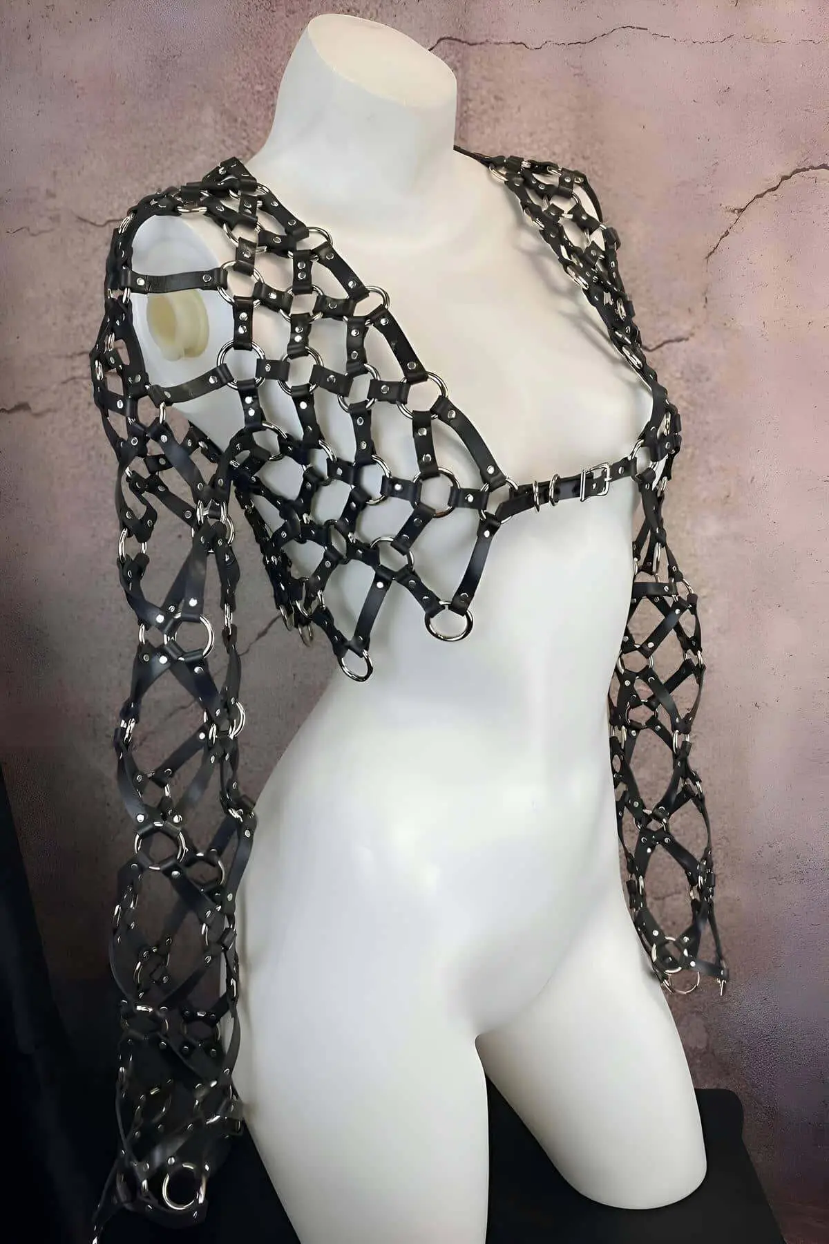 Experience the quality of premium materials without compromise. The durable black material offers the luxurious look and feel of **vegan leather** while maintaining flexibility. Versatility is key; wear this **long sleeve crop** over a simple bralette, layered with a mesh top, or as a standalone piece, transforming it into a unique **statement piece**. With its fully **adjustable body straps** and secure fastening mechanisms, this garment ensures both comfort and a compellingly bold look, making it a powerful addition to any Body Harness collection.