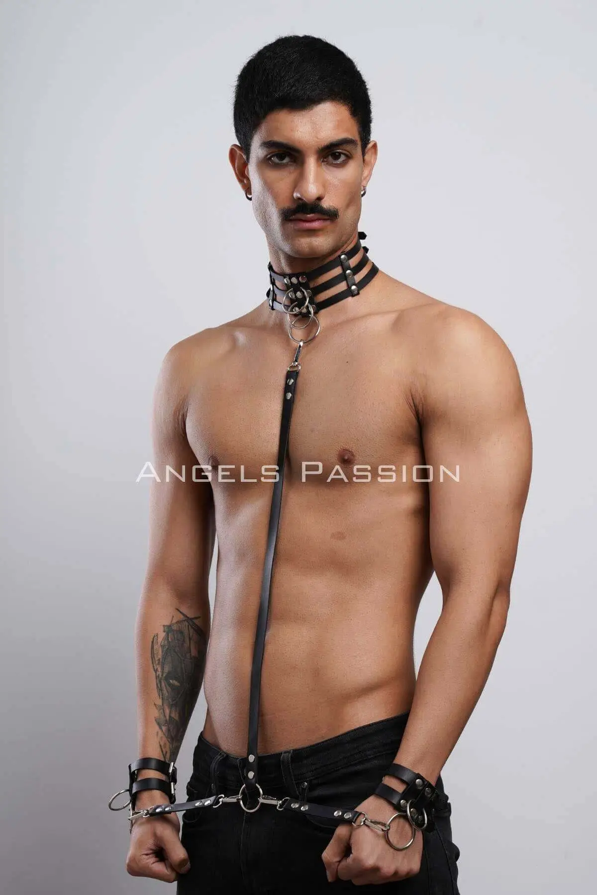 Forged from high-grade, cruelty-free PU material, the pieces in this set feature sturdy metal hardware and full adjustability, ensuring a secure and custom fit whether you’re out on the town or engaging in private play. The powerful aesthetic complements our full range of accessories. Complete your full look by pairing this with a rugged Men’s Harness or explore our entire collection of bold Choker designs to find your perfect statement piece.