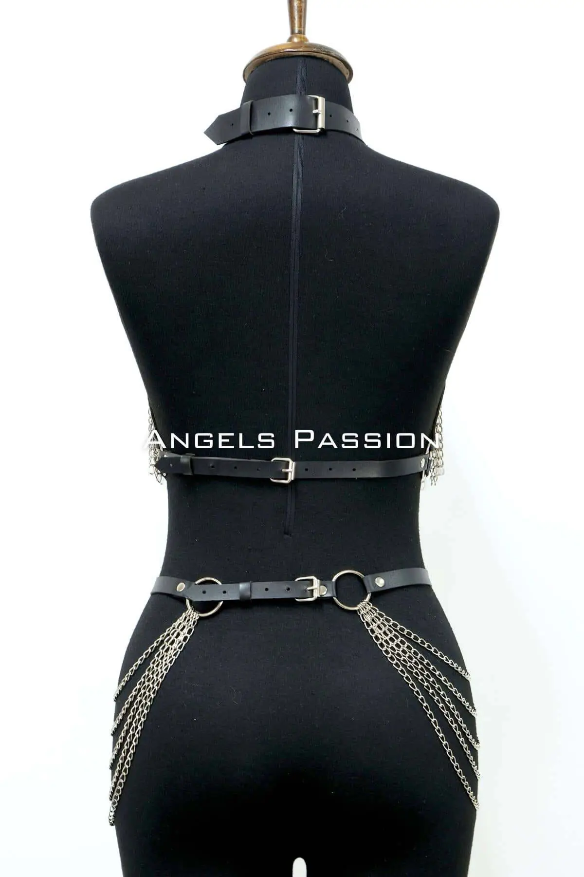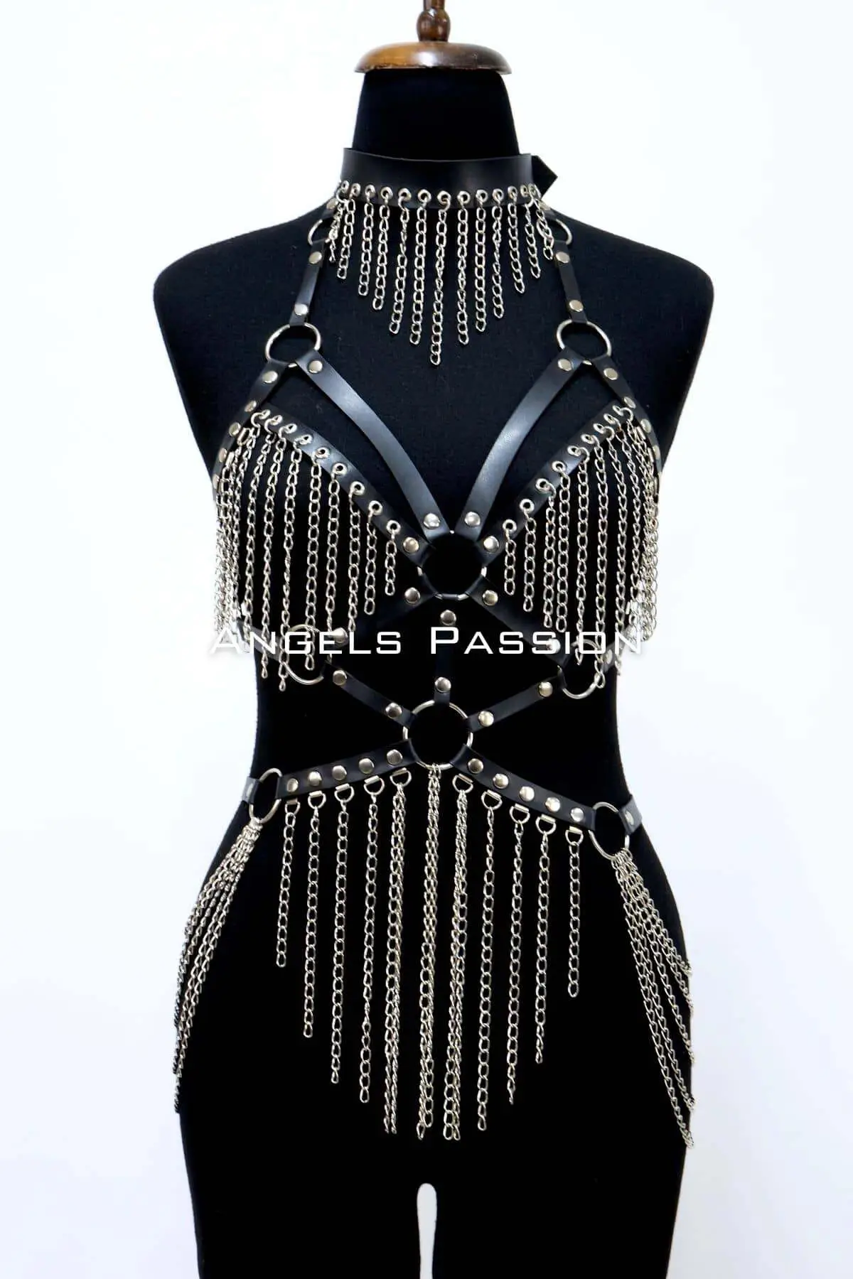 The visual impact of this piece is immediate, beginning with the integrated choker detail at the neck, which is anchored by a prominent central metal ring. From this ring, multiple chains cascade down the front of the body, adding beautiful movement and shimmer to the harness. The meticulous placement of the straps and metal hardware ensures a powerful silhouette. Explore more neck-defining accessories in our Choker collection. This leather harness set elevates a simple outfit, transforming it into an unforgettable look perfect for performance or evening wear.