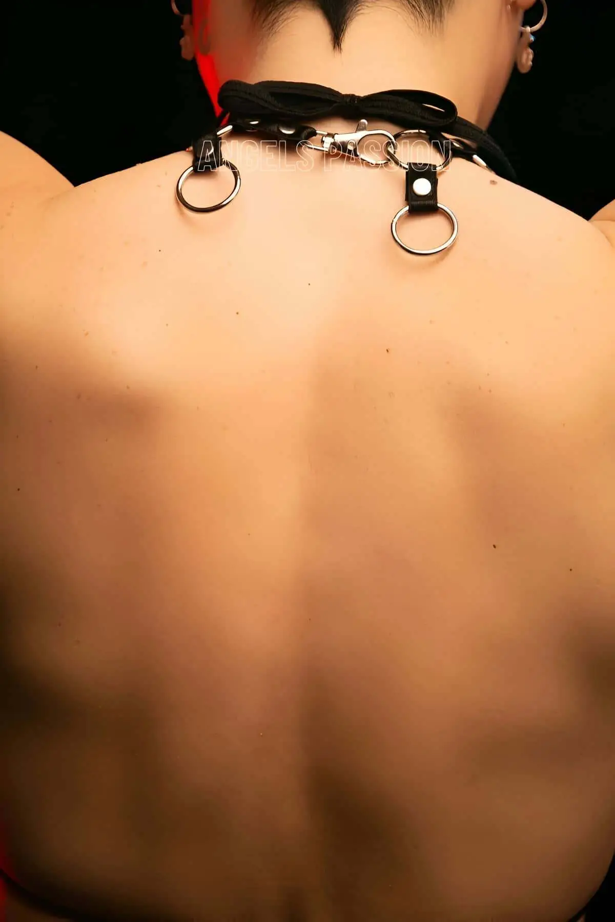 The strong, minimalist aesthetic of this **reflective accessory** pairs effortlessly with a wide range of looks. Use it to complete a cyberpunk outfit, a festival ensemble, or simply as an eye-catching element for a night out. Its dark base ensures versatility, while the reflective stripe provides a pop of dynamic light that is especially effective in low-light environments. For a coordinated, powerful ensemble, layer this piece with an adjustable Women’s Harness or a sophisticated Chest Harness . The graphic lines and bold material of the choker offer an immediate focal point for any outfit.
