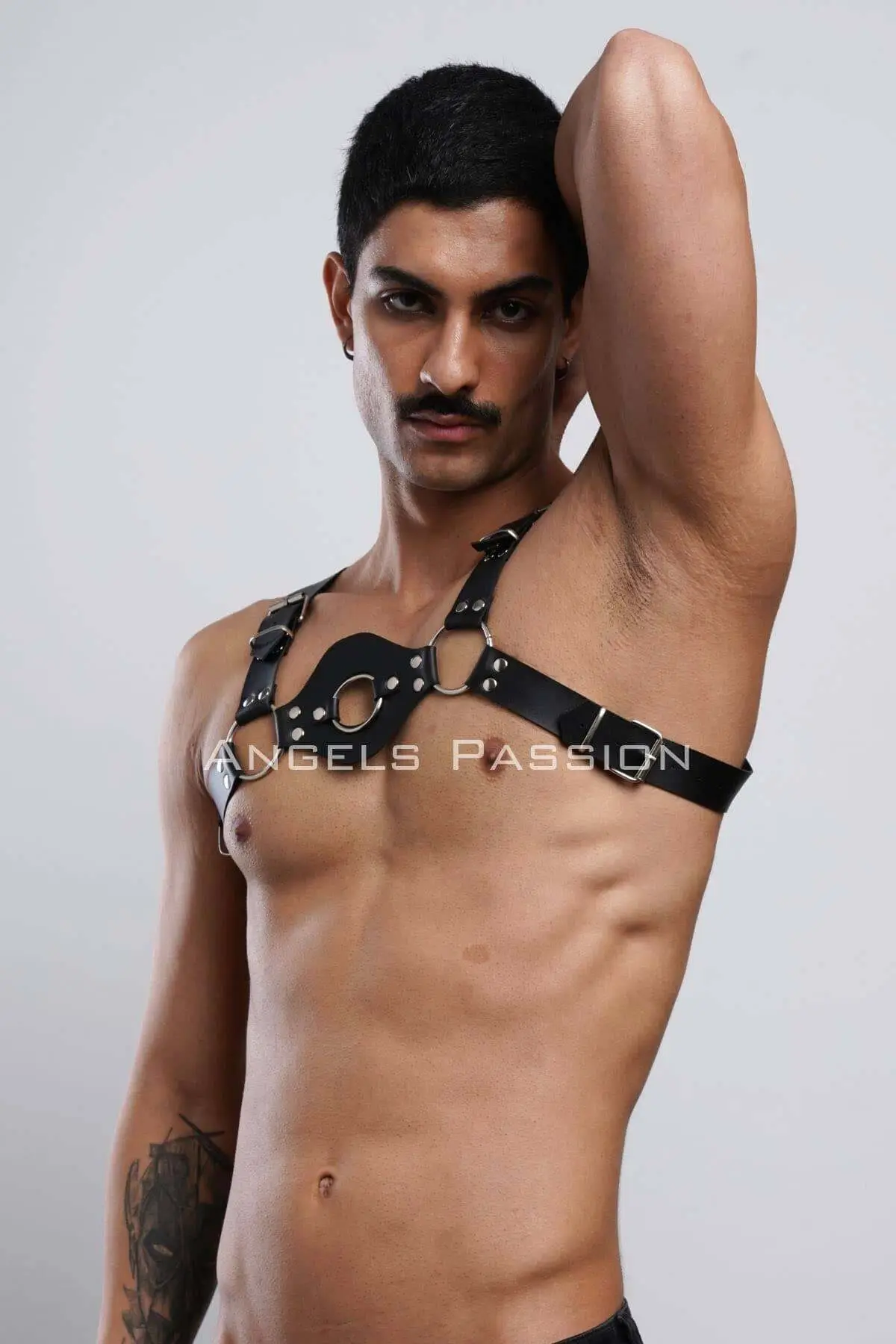 This men’s leather chest harness is meticulously crafted from premium, smooth vegan leather, offering a luxurious, supple feel that stands up to the demands of intense wear. The design features thick, architectural straps that frame the physique, highlighting the shoulders and chest for a truly commanding silhouette. Every component, from the robust, polished metal hardware to the reinforced stitching, is chosen to ensure this sophisticated fetish accessory is both durable and visually striking.