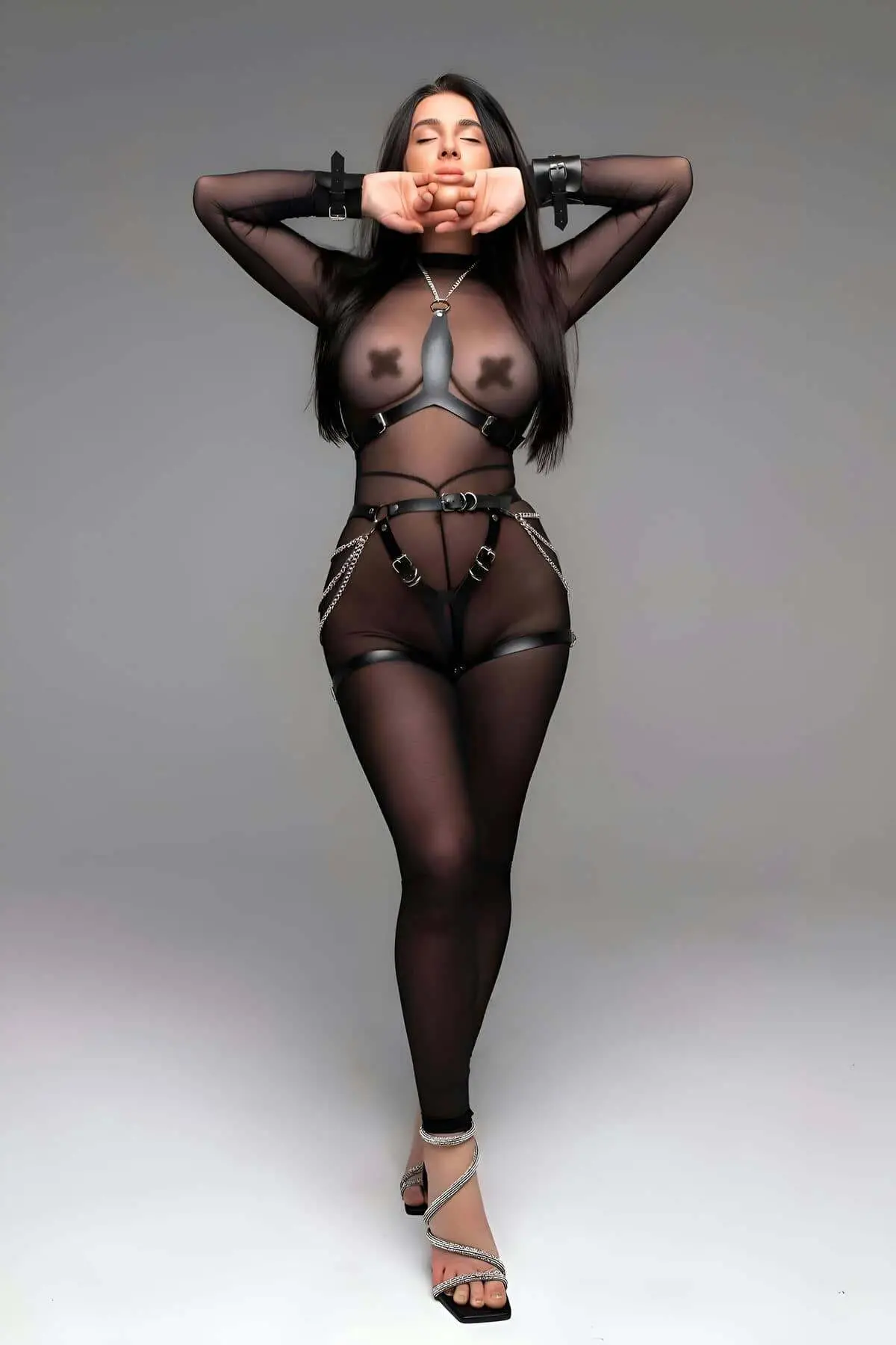 Elevate your collection with this unique offering that goes beyond standard lingerie. The bold, Body Harness style features of this set are enhanced by the unique handcuff charm accents, which are eye-catching Decorative metal charms. This ensemble provides high visual impact, whether worn as Strappy underwear or as a statement piece of bedroom apparel. It is the ideal selection for anyone seeking high-quality, and highly detailed sheer mesh lingerie that blends femininity with a dominant, contemporary edge, especially when paired with a matching Thong.