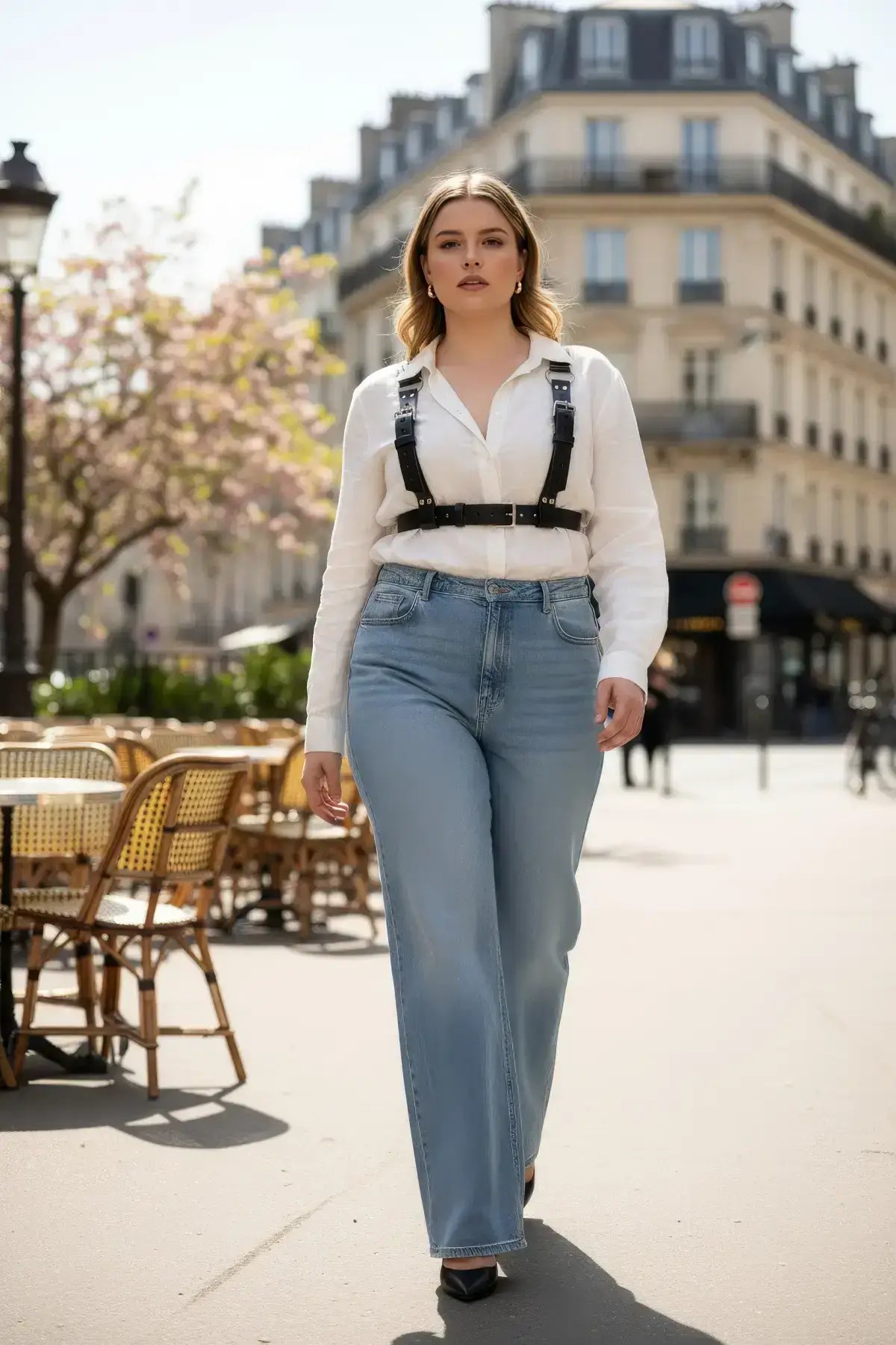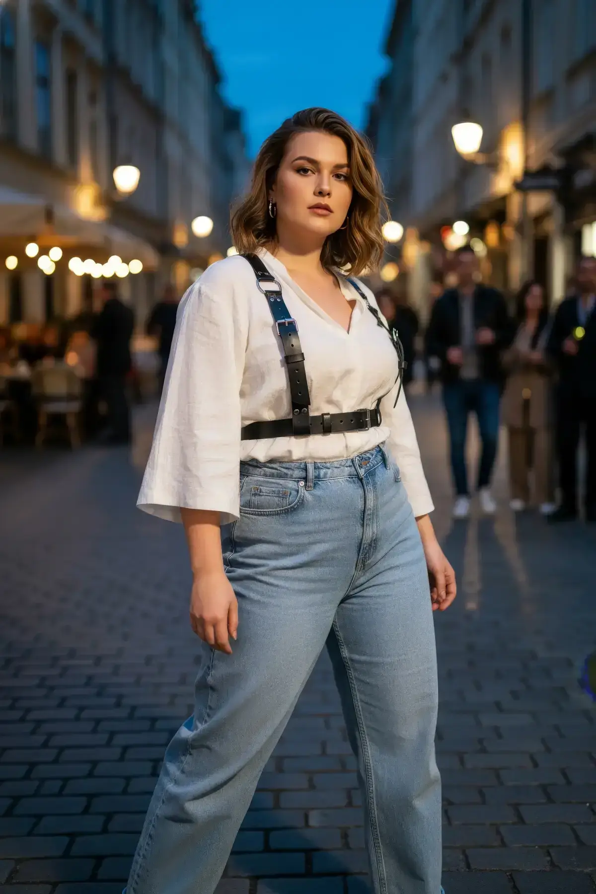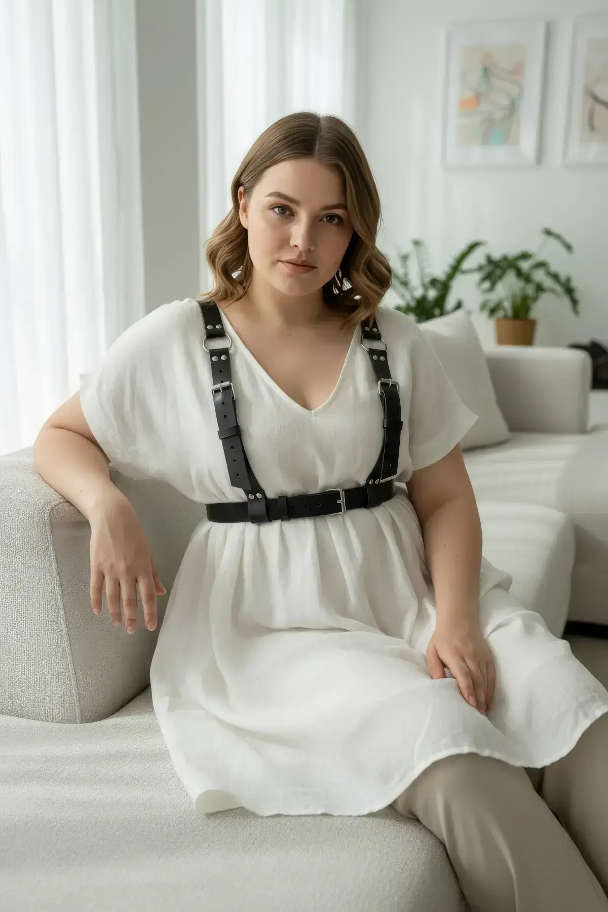 Step into your full power with this dramatic plus-size black leather harness belt. Designed to celebrate and accentuate the beautiful curves of every woman, this piece merges the structure of a corset with the edgy appeal of a Women’s Harness. It’s more than an accessory; it’s a statement of confidence and self-love, ensuring you feel sexy and completely supported.
