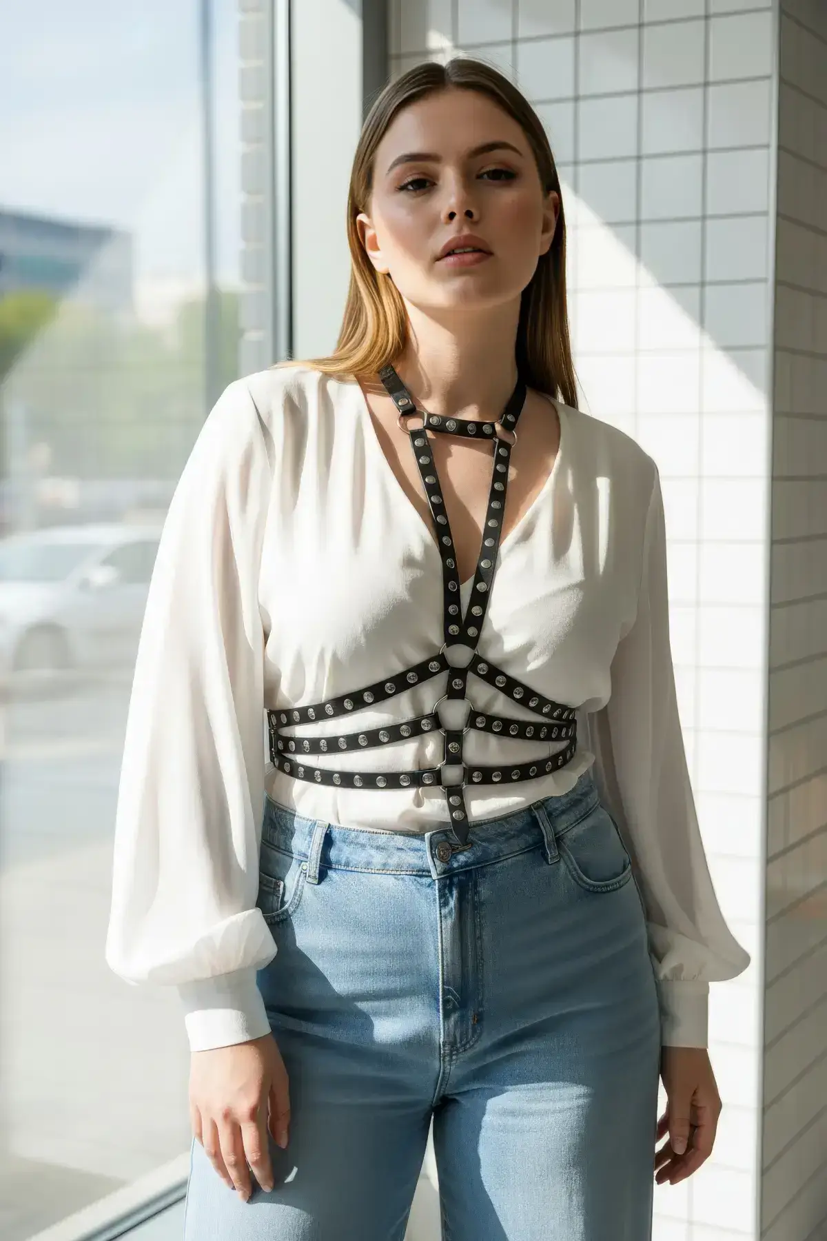 Elevate your confidence with the plus-size riveted leather body accessory, designed to hug and accentuate your curves in all the right places. This striking piece blends the boldness of punk rock with the seduction of fetish wear, making it an essential addition to any daring wardrobe. It transforms any basic outfit into a show-stopping ensemble, perfect for a night out or a festival. Browse our full collection of Body Harness styles for more statement pieces.