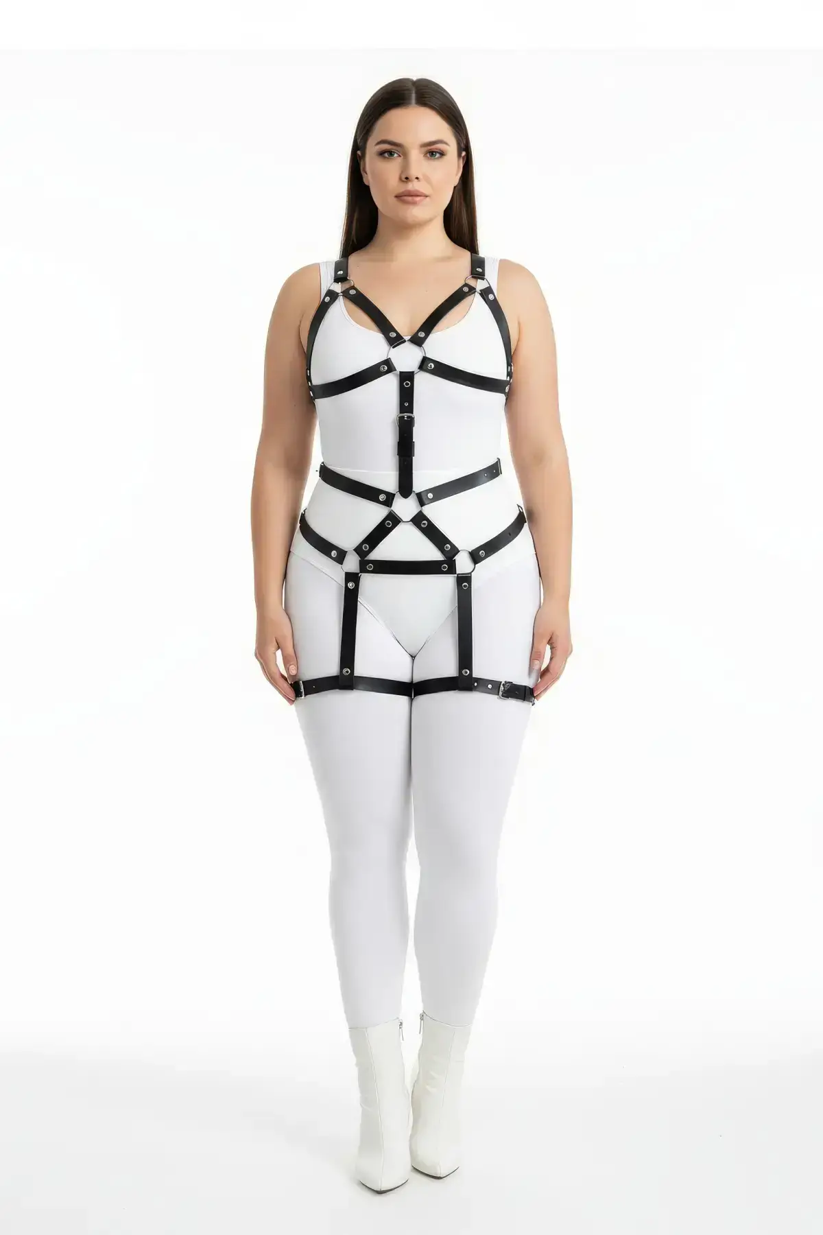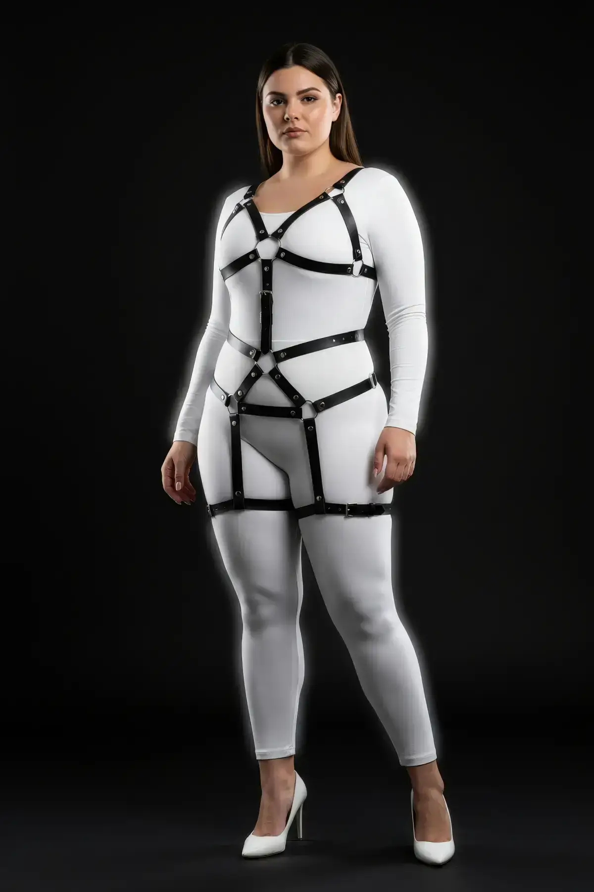 Move beyond traditional lingerie with this unique full **Body Accessory**. The design’s lower portion acts as a sleek high-waisted **Faux Leather Lingerie** piece, seamlessly integrating with the upper harness structure. Whether worn as captivating **Fantasy Wear** in the bedroom or styled over a simple top for a dramatic fashion statement, this set delivers bold confidence. Its unique bodysuit style replaces the need for a separate bottom, connecting the straps into a powerful Thong base, ensuring an unforgettable look from every angle.