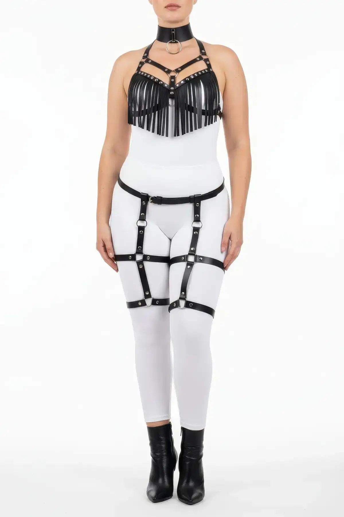 We specialize in providing high-quality, entity-rich fashion accessories that fit all body types. This Faux Leather Accessory utilizes high-quality, durable materials that look like leather but offer superior comfort and flexibility. The design features fully Adjustable Straps and buckles across the body, ensuring a flattering and secure plus size fit for all-day or all-night wear. As a complete **Harness Set**, it includes both the chest piece and the alluring wide-strap **Garter Harness** component with tassels.