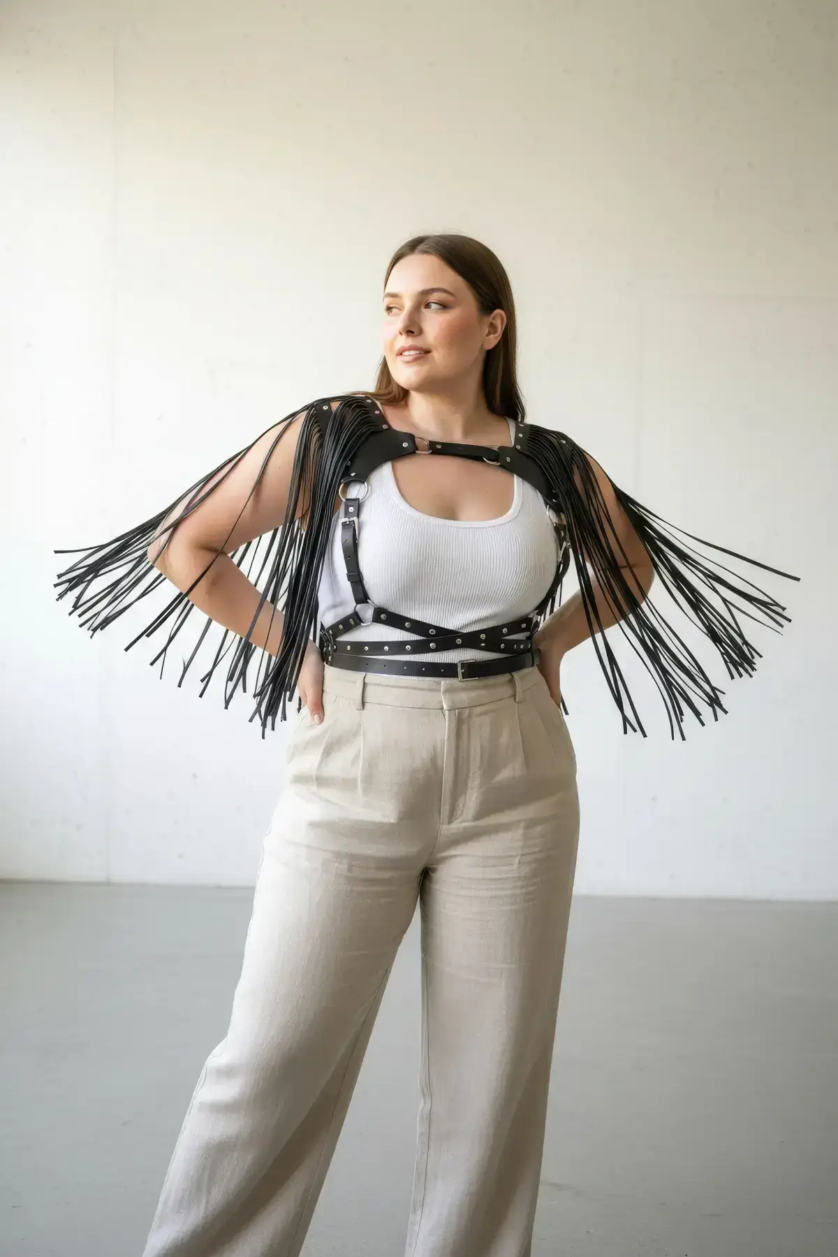 Unleash your inner confidence with this stunning plus size body harness. Designed specifically to celebrate and accentuate fuller figures, this accessory transforms any look from basic to breathtaking. The intricate strap work highlights your natural curves, while the playful, yet sophisticated, tassel detail adds a captivating movement that demands attention. It’s the perfect statement piece for a night out or a private moment.