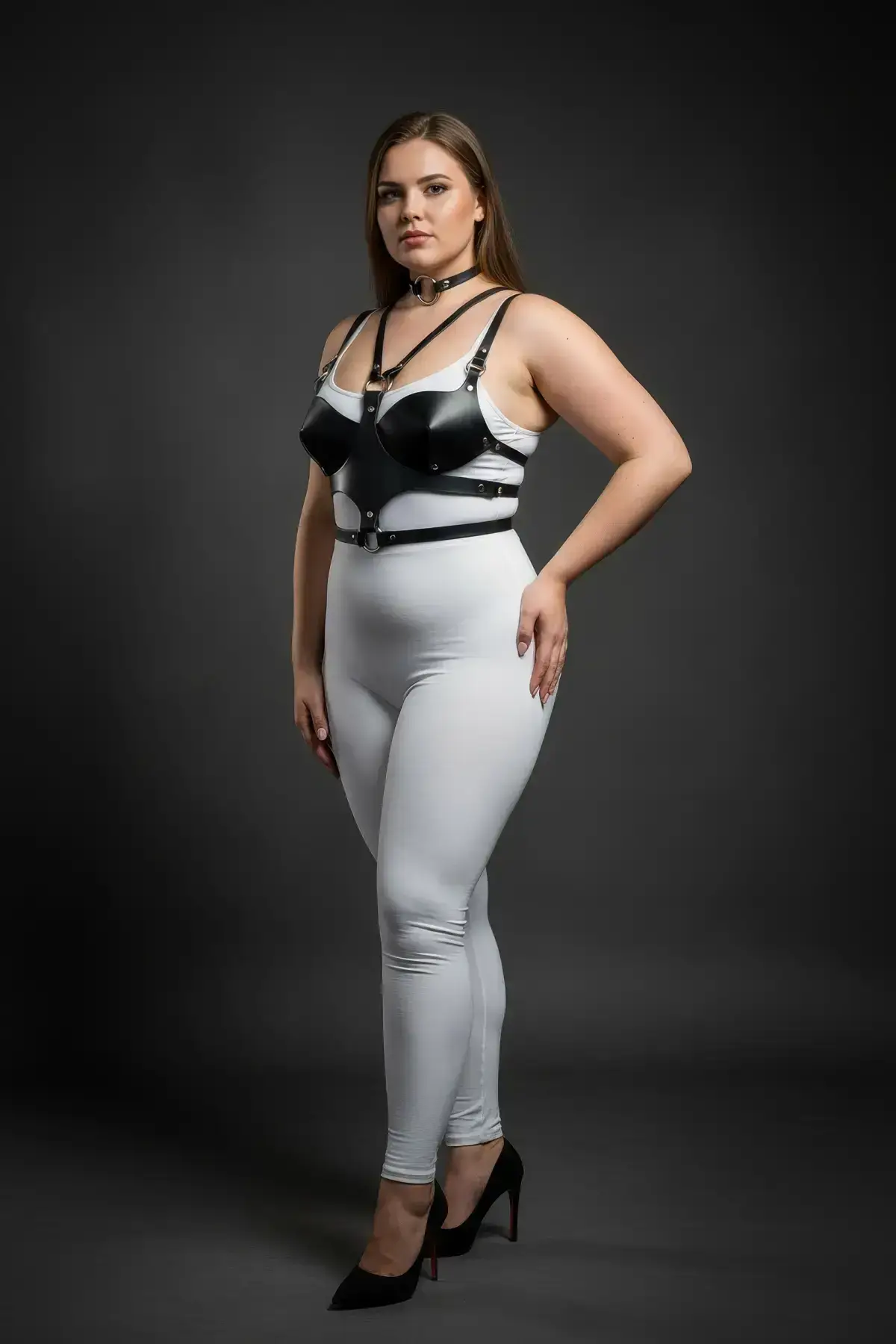 The high-quality faux leather (PU) material ensures durability while maintaining a supple, comfortable texture against the skin. Its construction reflects a commitment to craftsmanship, proving expertise in alternative styling. The dramatic Choker component makes this a versatile piece, instantly transforming any outfit into a powerful ensemble with a distinct gothic style. Whether your intent is a glamorous photoshoot, a club night, or adding an edge to your everyday wardrobe, this plus size chest harness is the definitive choice for a sophisticated, confident style.