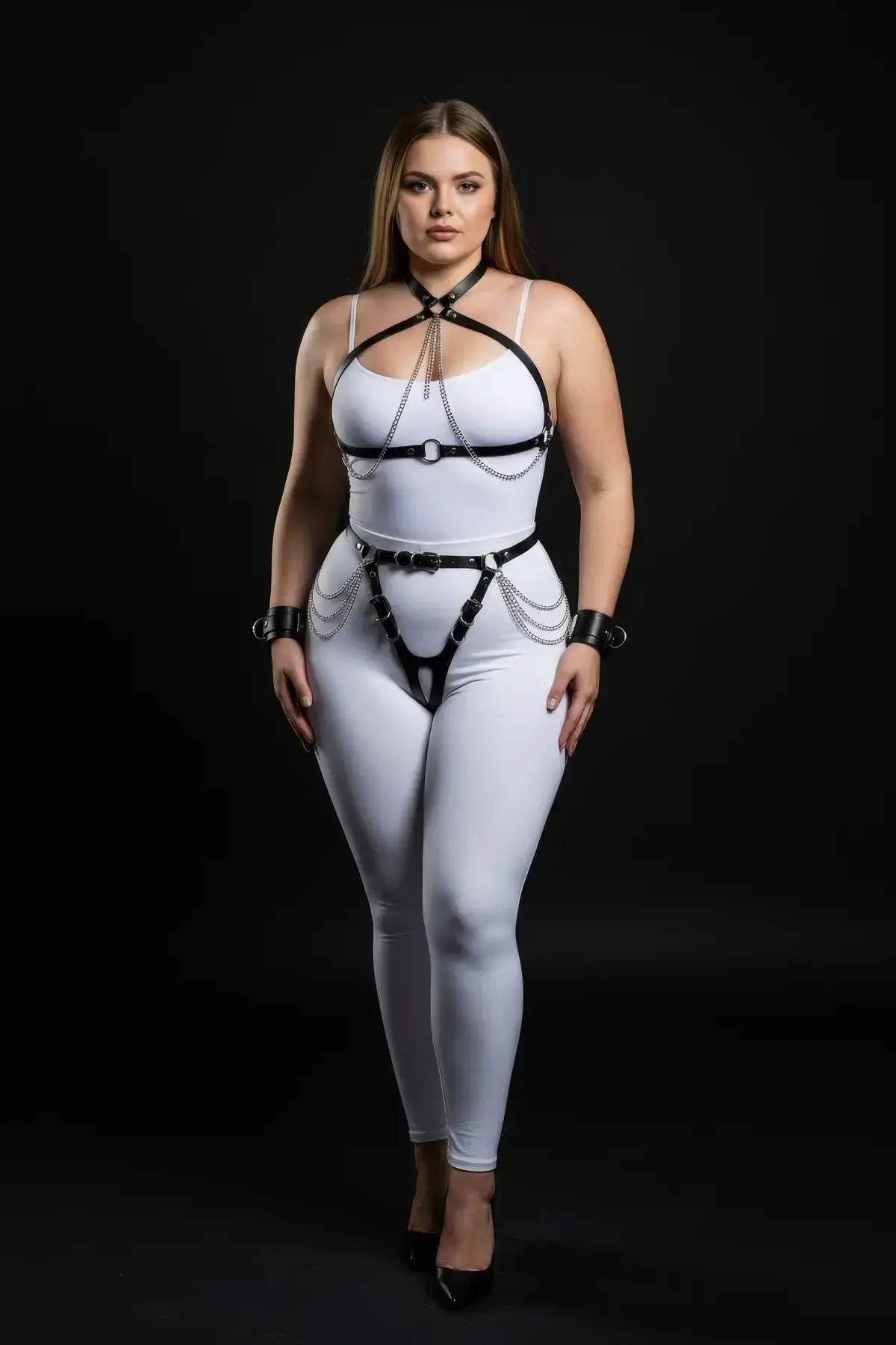 Plus Size Black Women’s Leather Harness Set with Chain and Garter Details – SH1224
