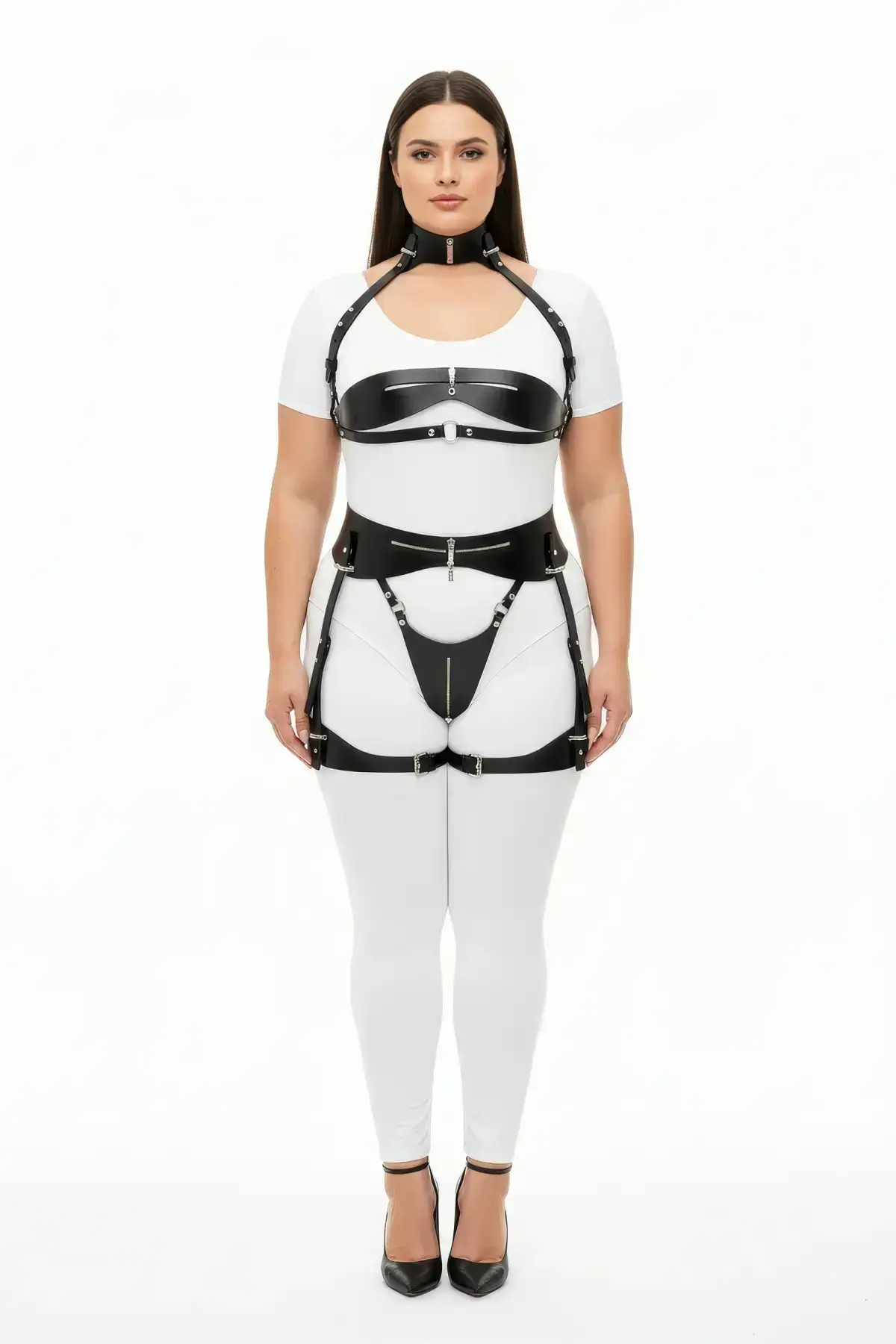Achieving an impeccable fit is effortless with this ensemble. The design features multiple adjustment points utilizing nickel-tone hardware, allowing you to customize the chest, waist, and thigh circumference for maximum comfort and a perfect, tailored look. Unlike standard accessories, this full-body piece is engineered for the curvy woman, providing reliable support and a sensually structured outline. The lower half of the Garter Harness section connects seamlessly to the upper Body Harness, creating a cohesive, head-to-toe ensemble that defines and celebrates your natural shape.