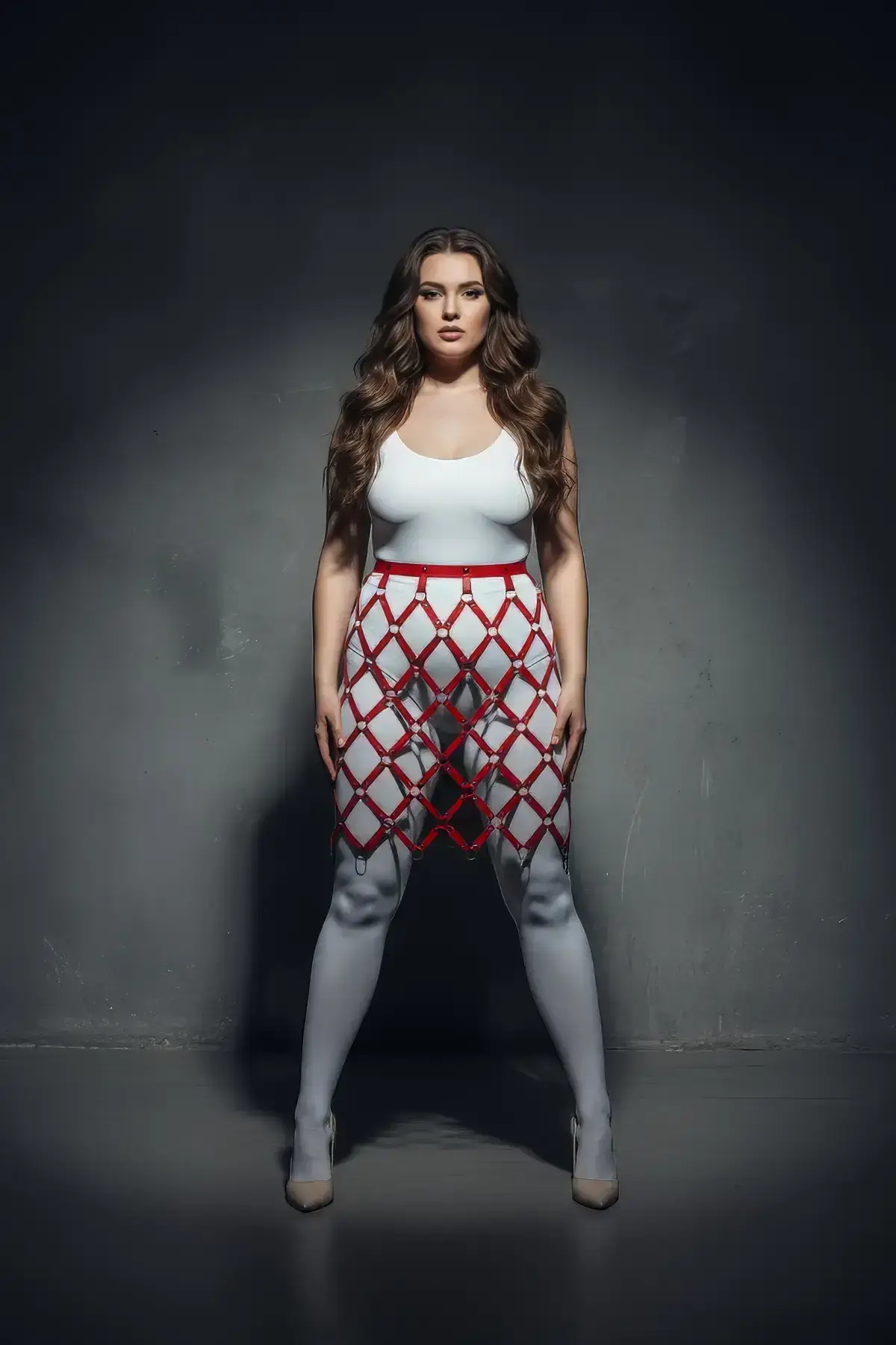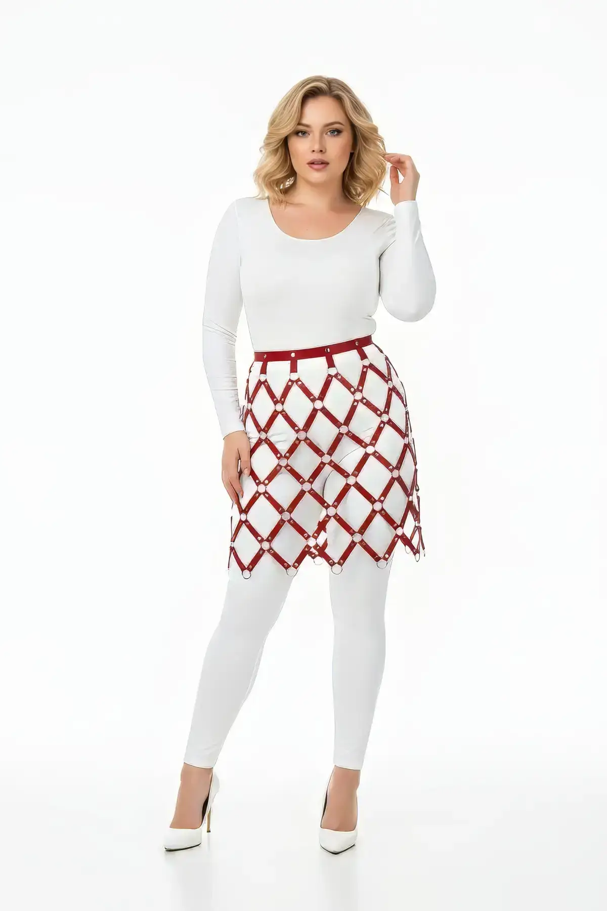 Unleash your inner confidence with this stunning Red Leather Skirt featuring an integrated, high-impact cage design. This high-waisted plus size fashion statement piece showcases a vibrant, shiny red vinyl material that catches the light from every angle. The mini-length skirt boasts a figure-hugging, body-contouring silhouette, perfectly matched with the bold, multi-strap harness that wraps elegantly around the waist and hips, creating a structured, geometric appeal.
