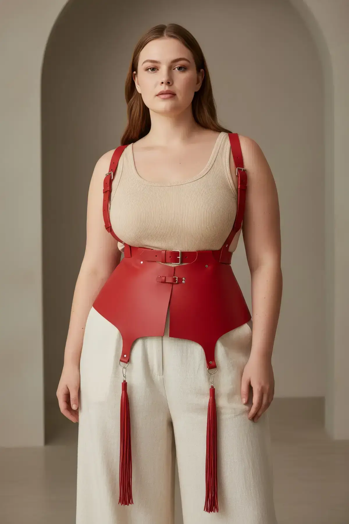 Forget simple accessories; this vibrant piece is a full fashion overhaul. The rich red faux leather and intricate strap pattern hug your body in all the right ways, cinching the waist for an hourglass figure. It’s more than just a belt; it’s a piece of wearable art, designed to boost your confidence and celebrate your form. Pair it with a simple black dress or layer it over a crisp white shirt for an unforgettable silhouette.
