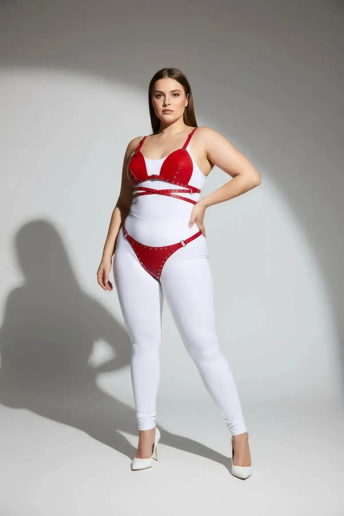 Capture attention in this breathtaking Plus Size Red Women’s Harness Set, a striking piece of sensual lingerie that instantly elevates your look. Crafted from smooth, vibrant faux leather, this multi-piece ensemble is designed to perfectly contour and celebrate the full figure, as shown draped across the model. Note the intricate placement of the small, silver-toned studded accessories which run along the straps, offering an unmistakable touch of edgy fashion. This complete set includes a supportive bodice component and detachable Garter Harness straps, making it a powerful foundation for any outfit or boudoir scenario.