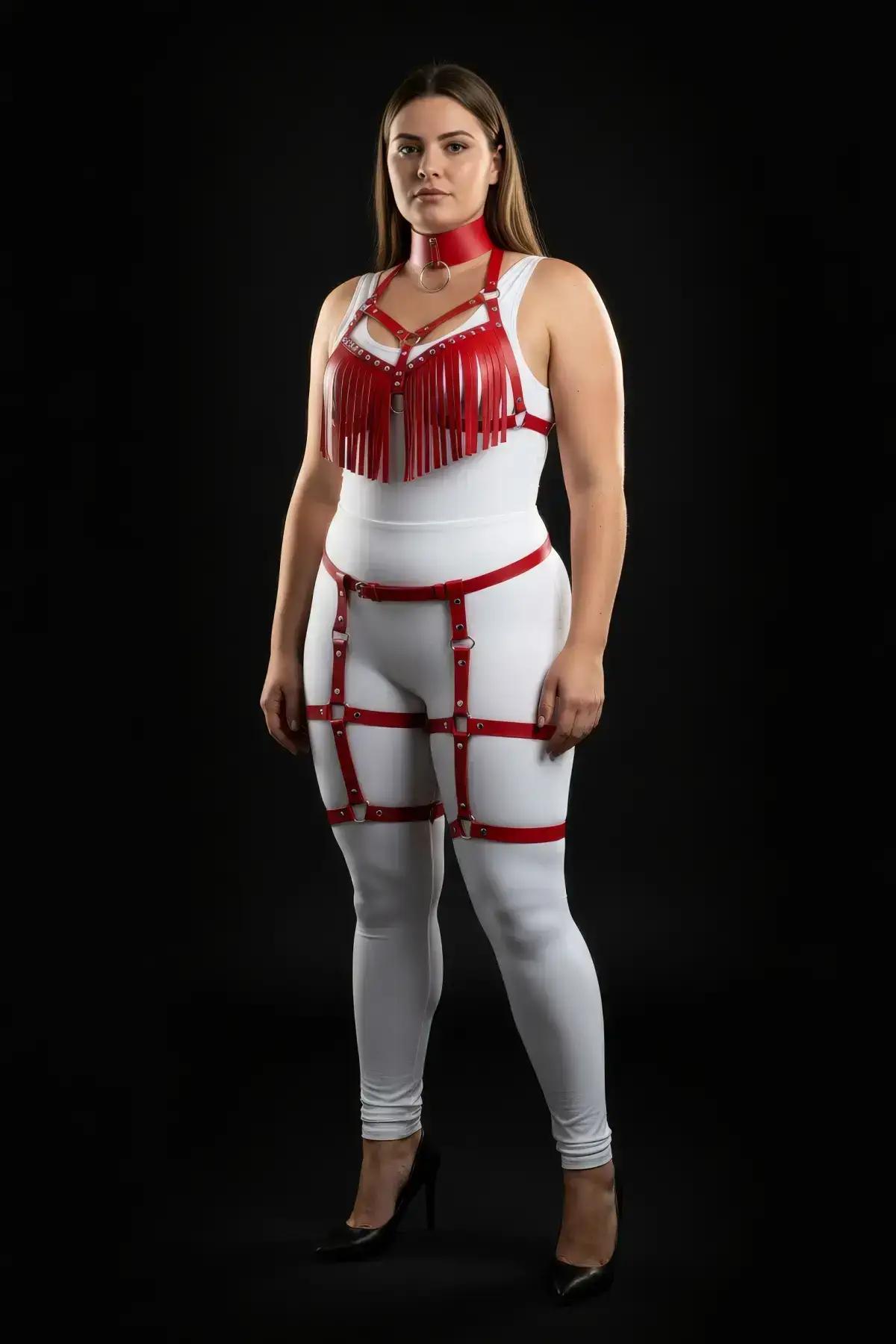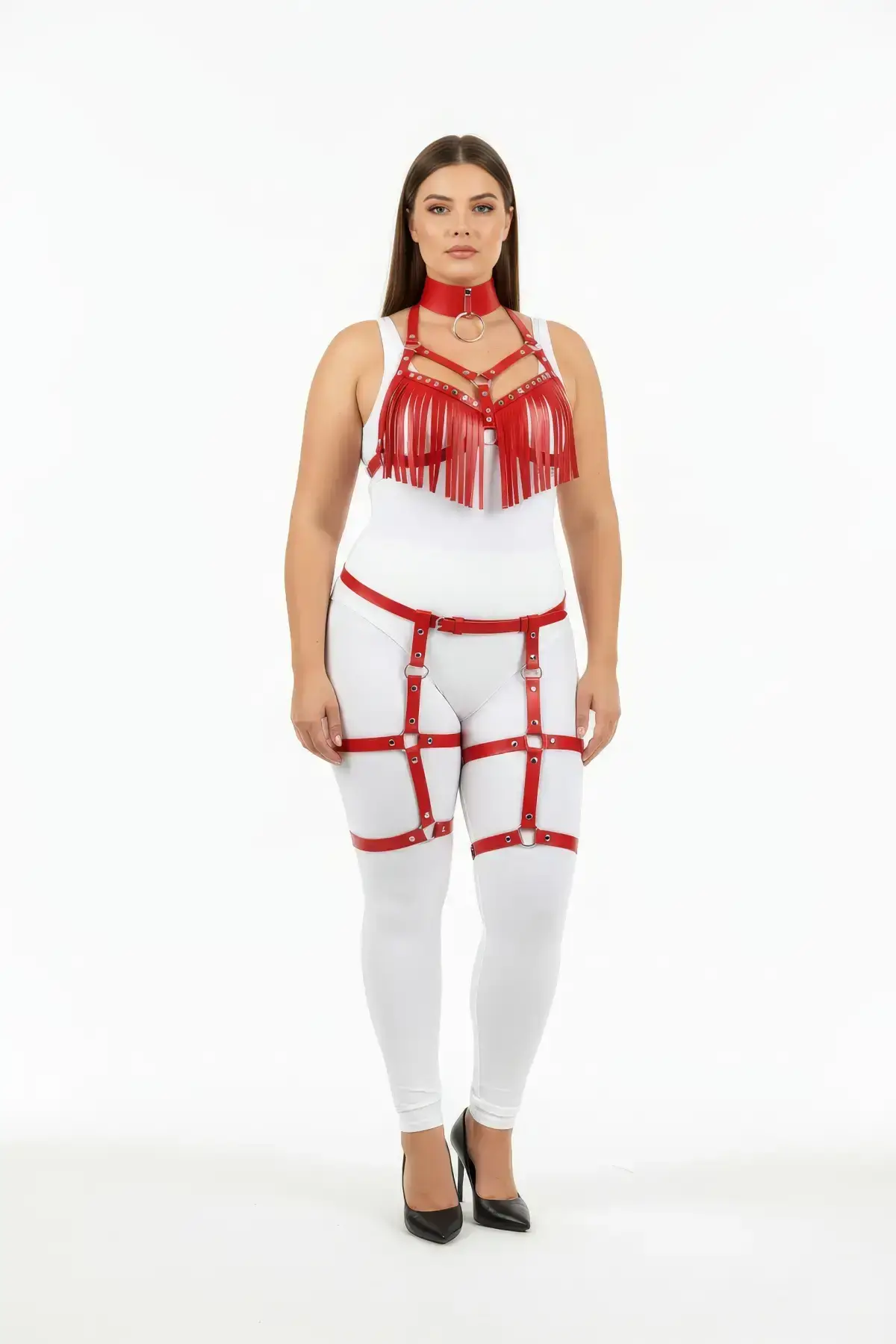 Plus Size Red Women’s Leather Harness Set with Tassel Detail and Garter Belt – SH715