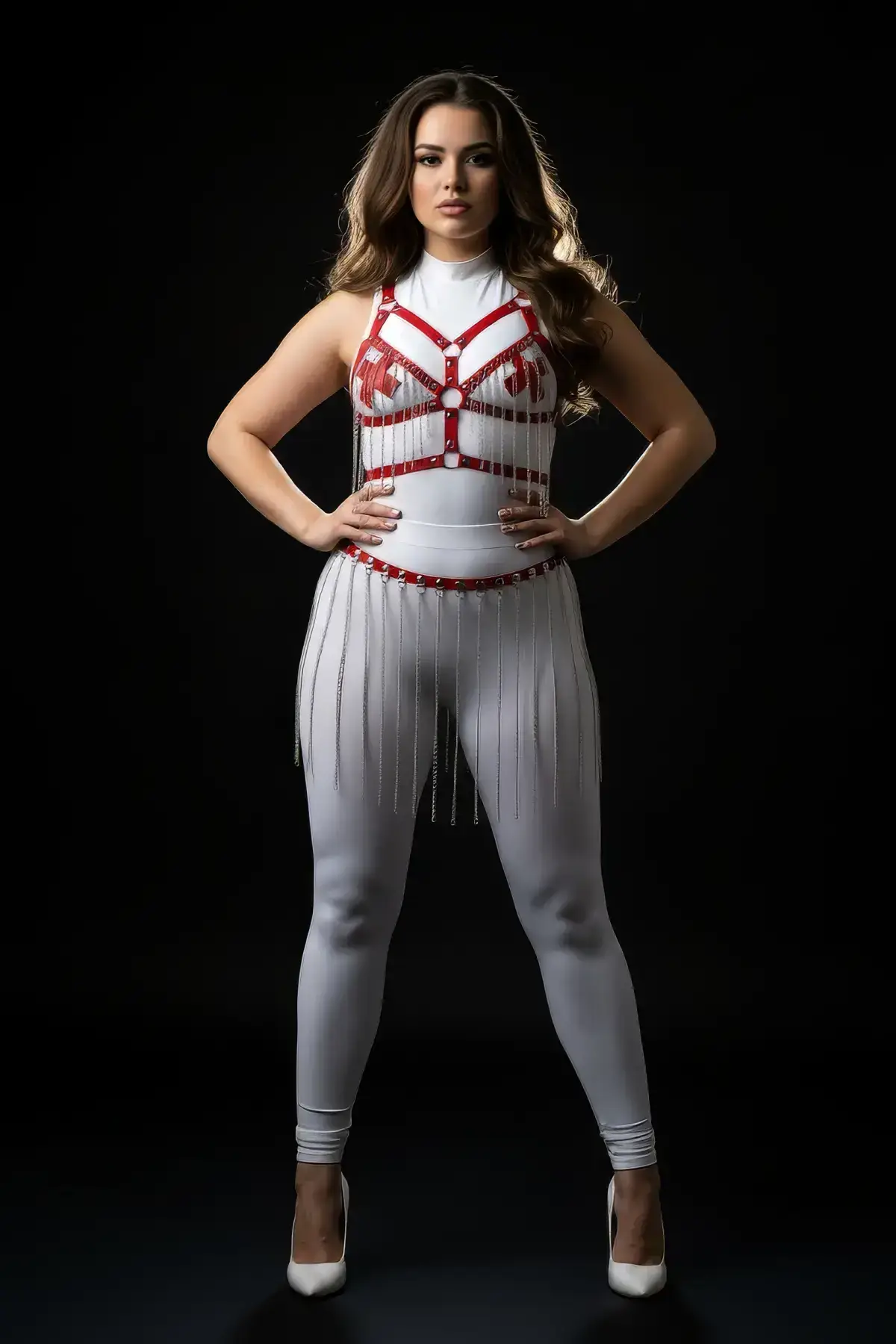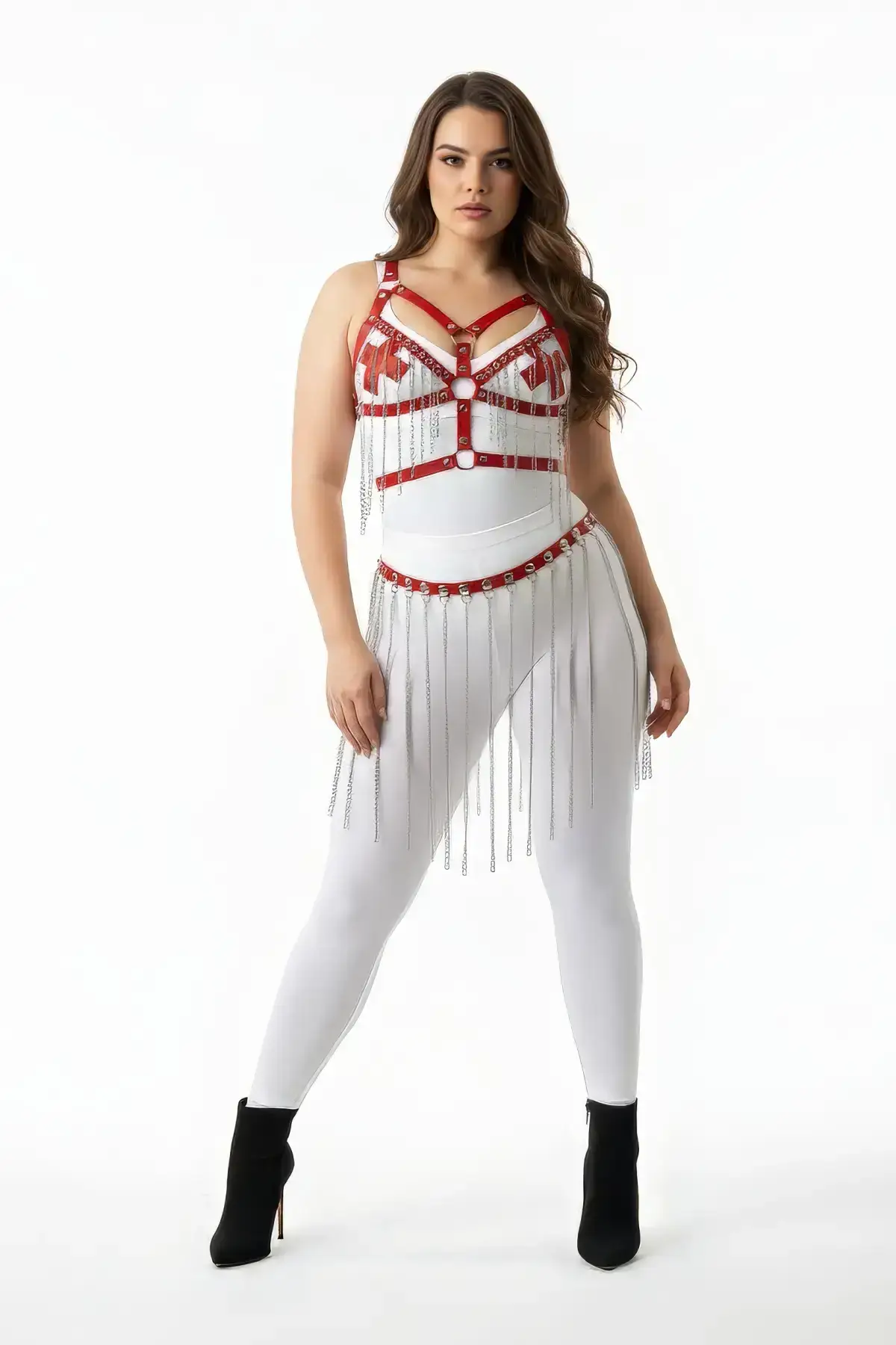 Achieve the ultimate fashion-forward look with this instantly put-together combination. The inclusion of the Plus Size White Skirt ensures a comfortable fit that flatters, while the detachable Faux Leather Harness allows for versatile styling. The prominent Chain Detail Skirt aesthetic transforms a simple mini skirt into a high-octane ensemble perfect for festivals, club wear, or a daring photo shoot. This piece targets the transactional intent of shoppers looking for a ready-to-wear, impactful outfit that stands out from the crowd.