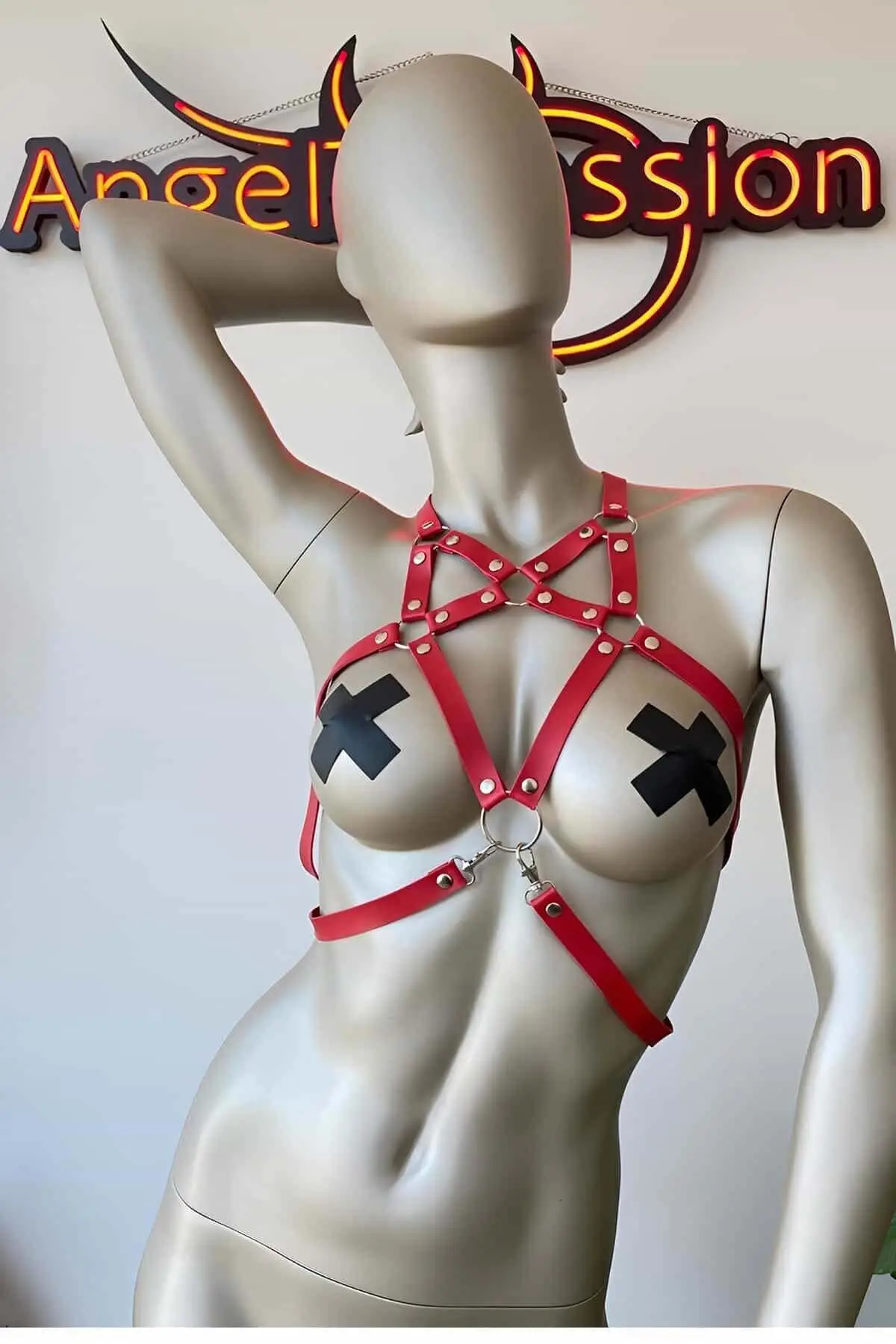Unleash an aura of confidence with the truly captivating Red Leather Chest Harness. This statement piece is meticulously crafted in a vibrant, smooth red leather-look material, instantly drawing the eye. The symmetrical, bold design features multiple straps connected by polished chrome O-rings, forming a distinctive X-pattern across the torso. Far more than just an accessory, this is a wearable piece of art designed to elevate any outfit from mundane to mesmerizing.