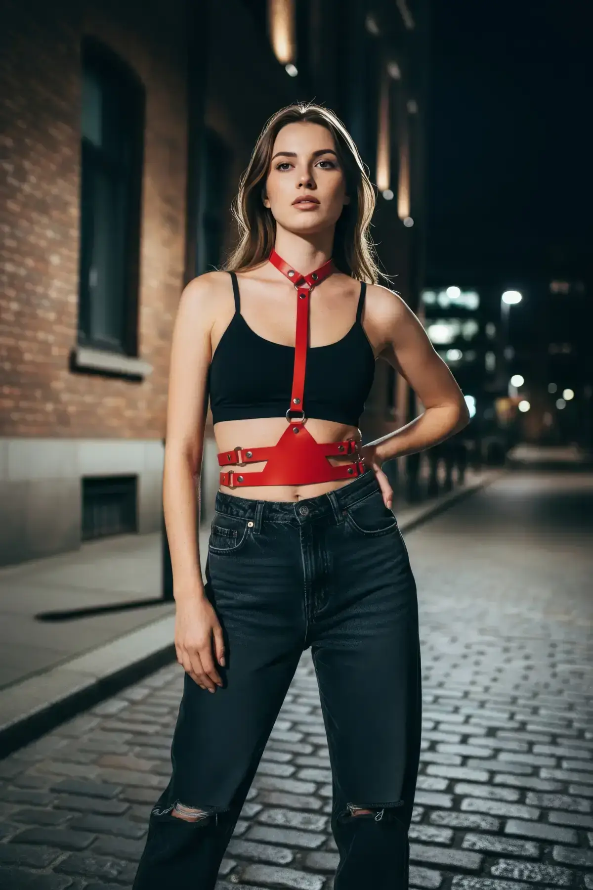 Make an unforgettable entrance with this striking red women’s leather belt. More than a simple waist accessory, this piece is an intricate body accessory featuring multiple adjustable buckles that transform any outfit into an edgy, statement-making ensemble. Itβs the perfect way to add a dynamic splash of color and architectural detail, blurring the line between a traditional belt and a stylish Body Harness.
