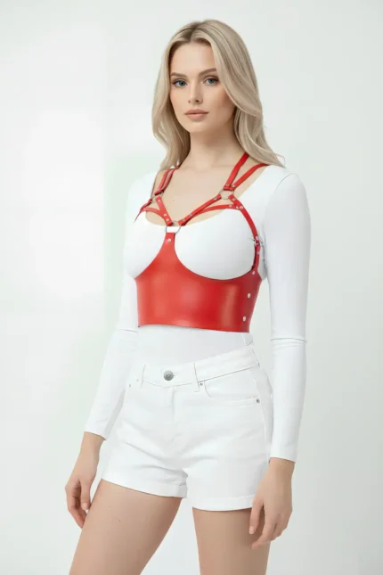 Red Garter Harness, Leather Textured Body Accessory with Metal Ring Details – SH502