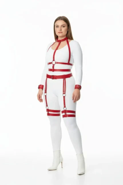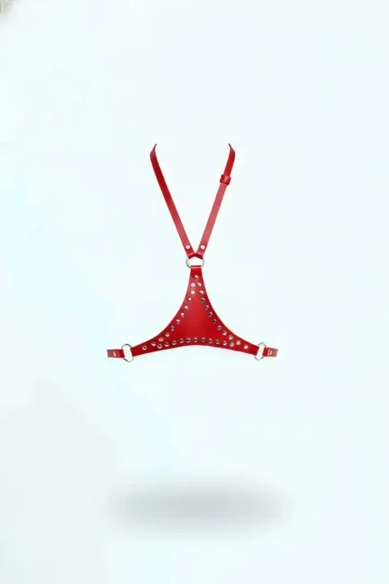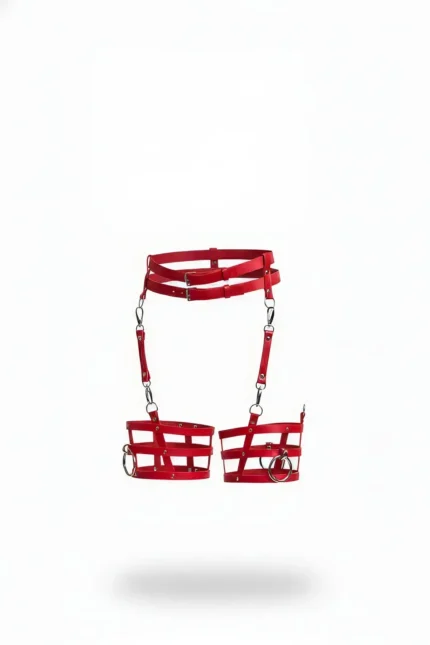 Red Garter Harness with Leather Buckle and Cage Detail – SH705