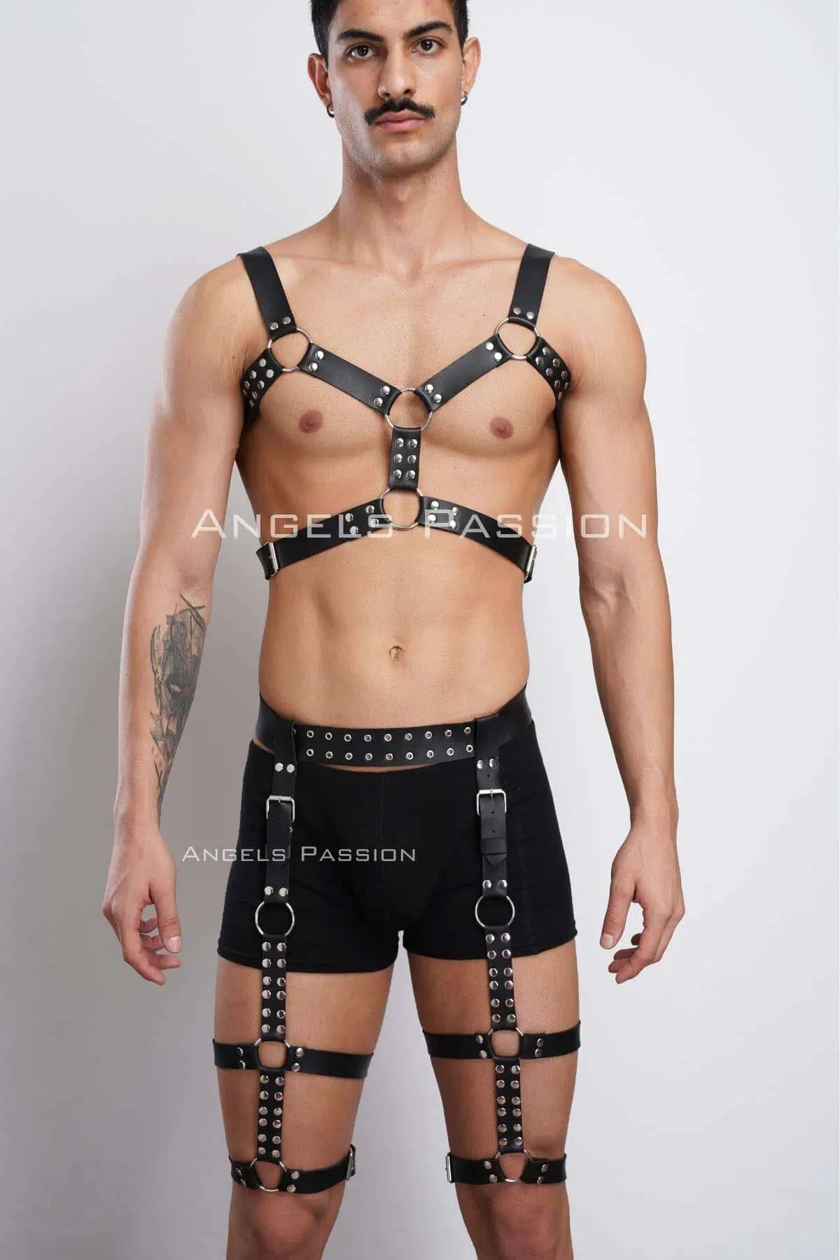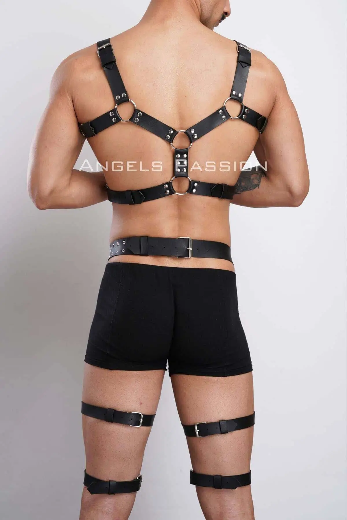 Every line and curve of this two-piece set has been engineered to highlight the male physique. Crafted from resilient, high-grade faux leather, the strapping is both supple and strong, ensuring it holds its form while remaining comfortable. The deep black finish, accented by polished metal hardware, exudes power and a masculine edge. This is not merely an accessory; it is a piece of wearable architecture that defines your torso and legs with arresting precision, elevating your personal style to a level of unparalleled confidence.