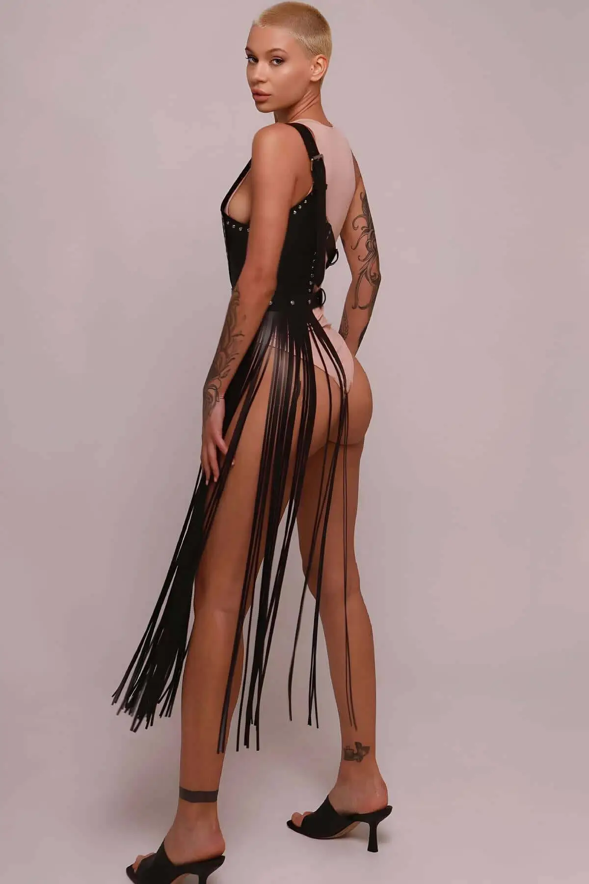 Expertly constructed from durable, supple faux leather, the Tasseled Leather Jacket Harness offers premium texture without sacrificing comfort. Attention to craftsmanship is evident in the polished silver-toned rings and sturdy adjustable straps. These crucial components ensure that this **Chest Harness** provides a secure and customized fit for various body types. The design ensures the stunning tassels hang perfectly, creating a dynamic silhouette that highlights the shoulders and upper torso. Pair this piece with a sleek black top and a **Leather Skirt** for an unmissable look.