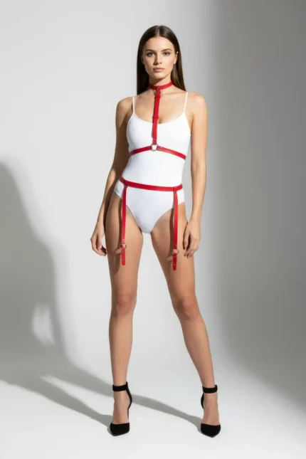 47,9 $Red Harness Set with Leather Neck Strap and Garter Details – SH230